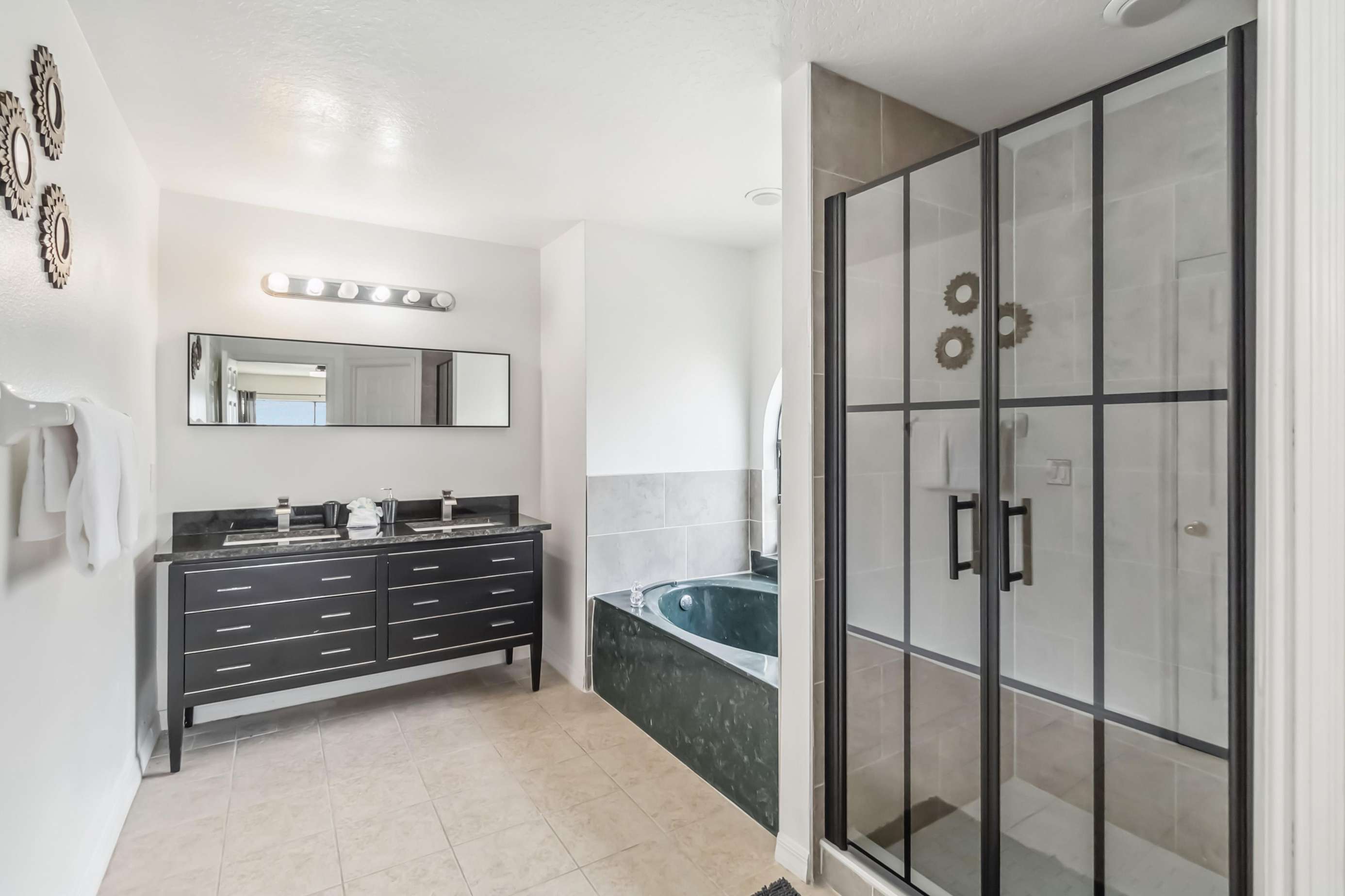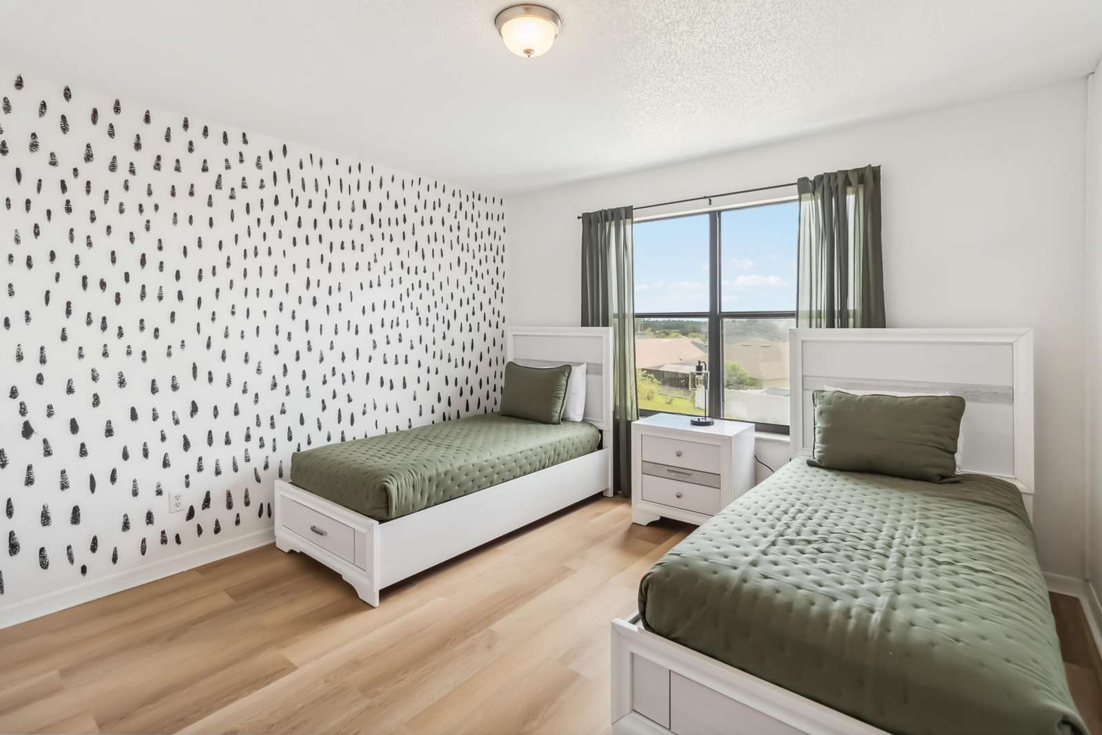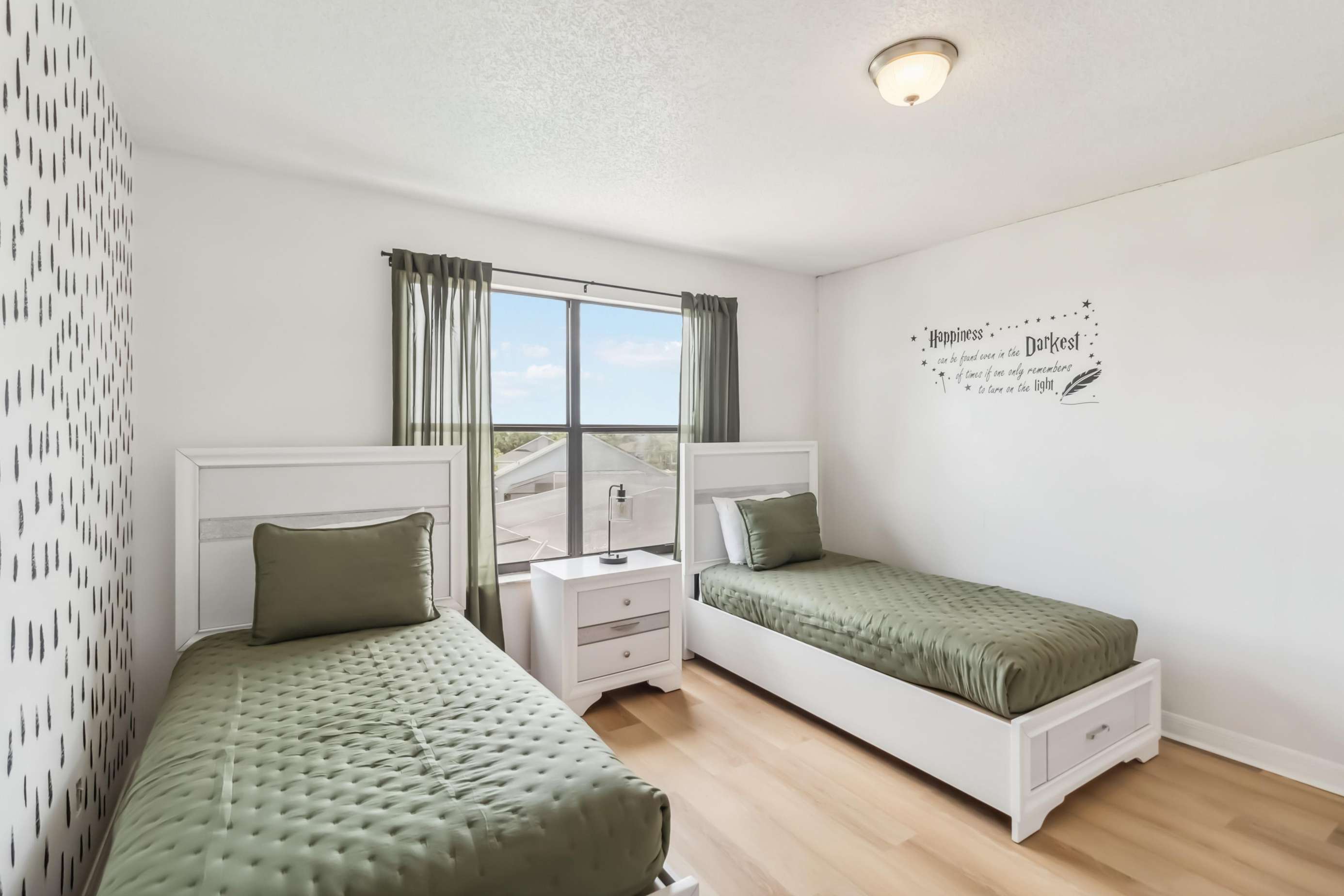 • Bedroom 5: Two twin beds with modern green and black accents