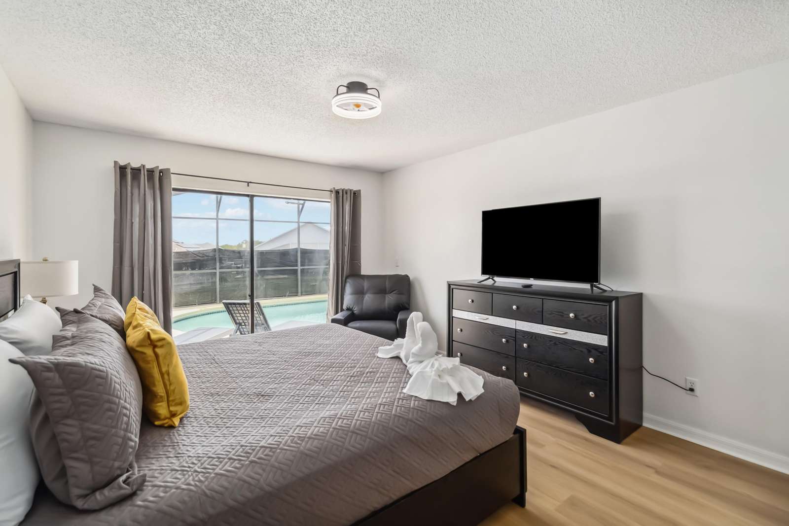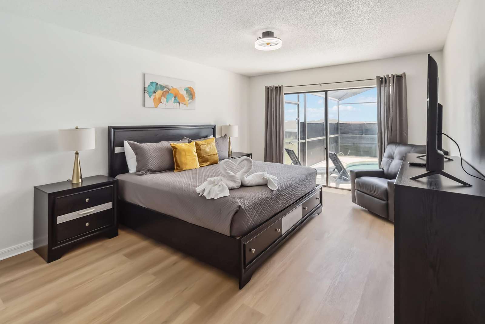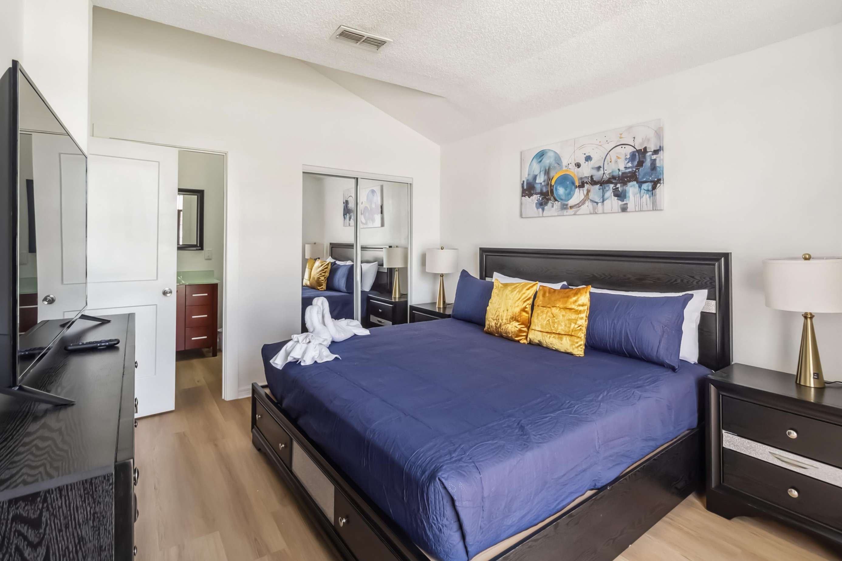• Bedroom 1: King bed, large flat-screen TV, and private en-suite bathroom