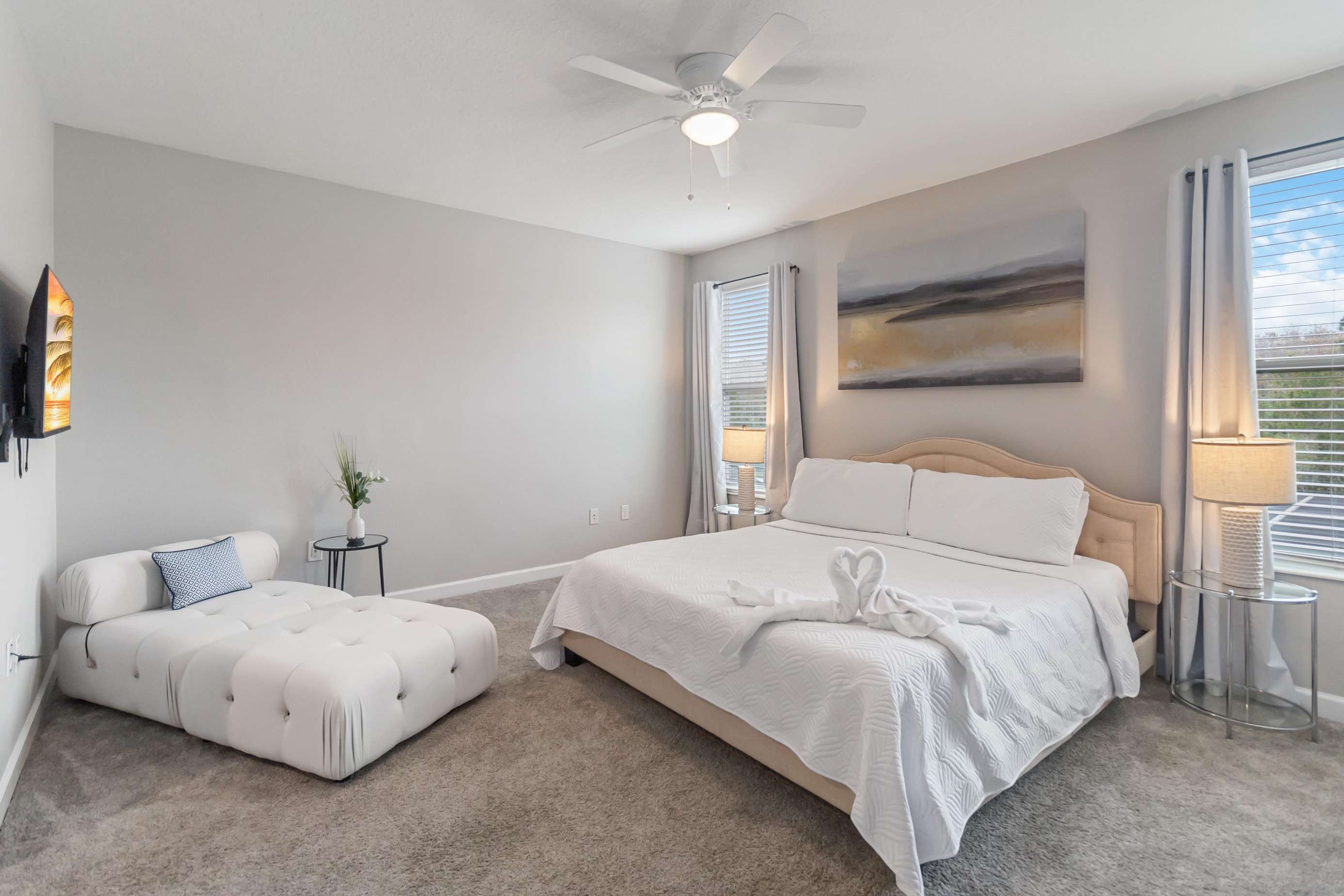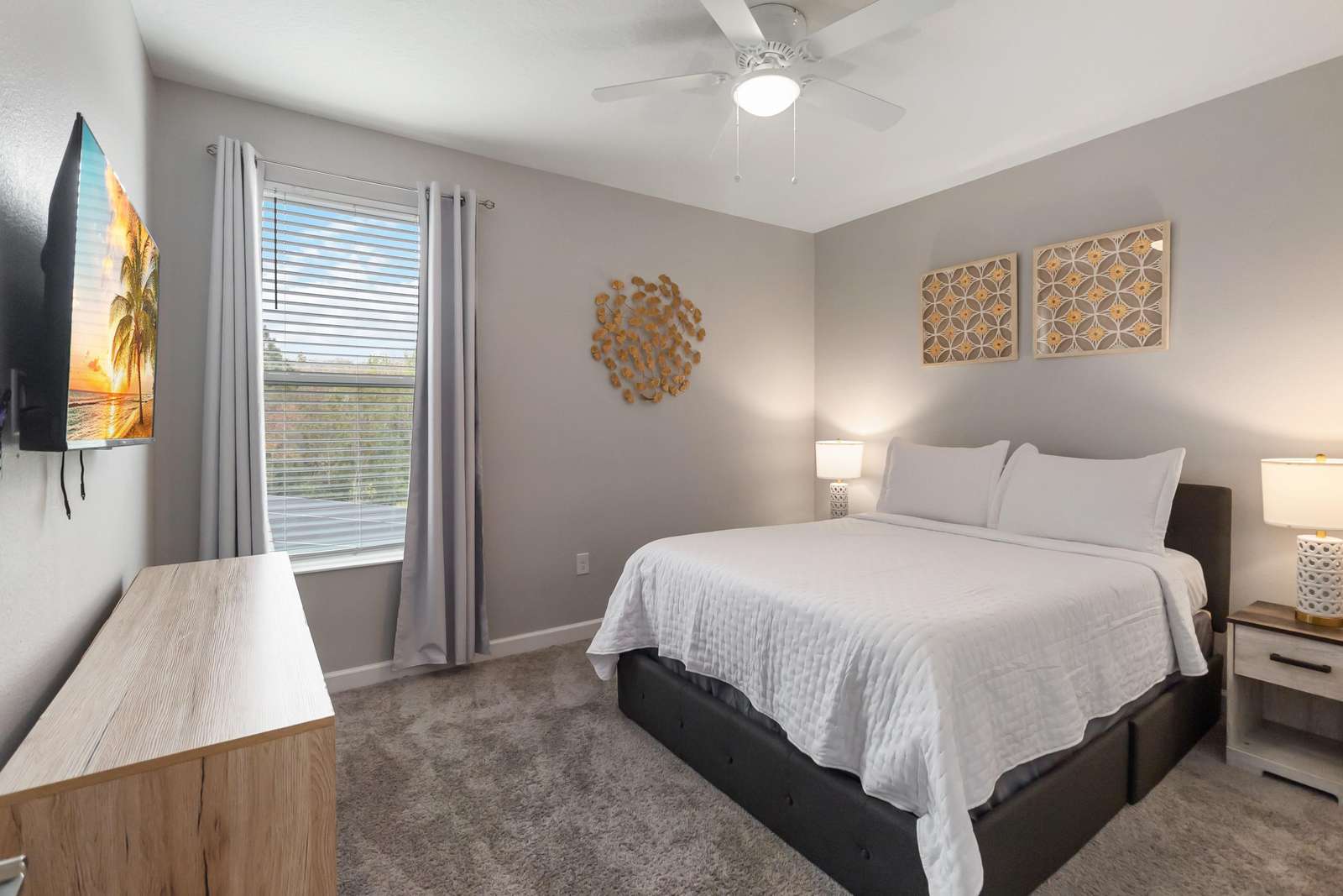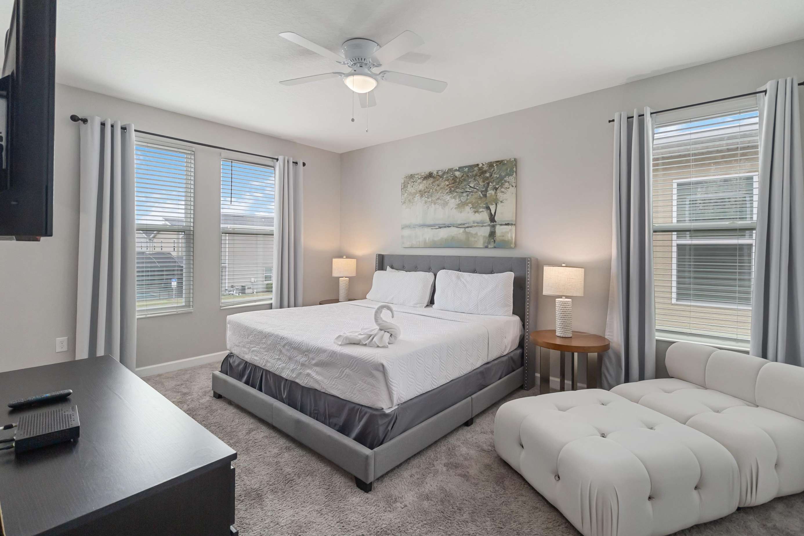 Bedroom #5: Queen-size bed • TV. Comfortably furnished with a clean, modern style.