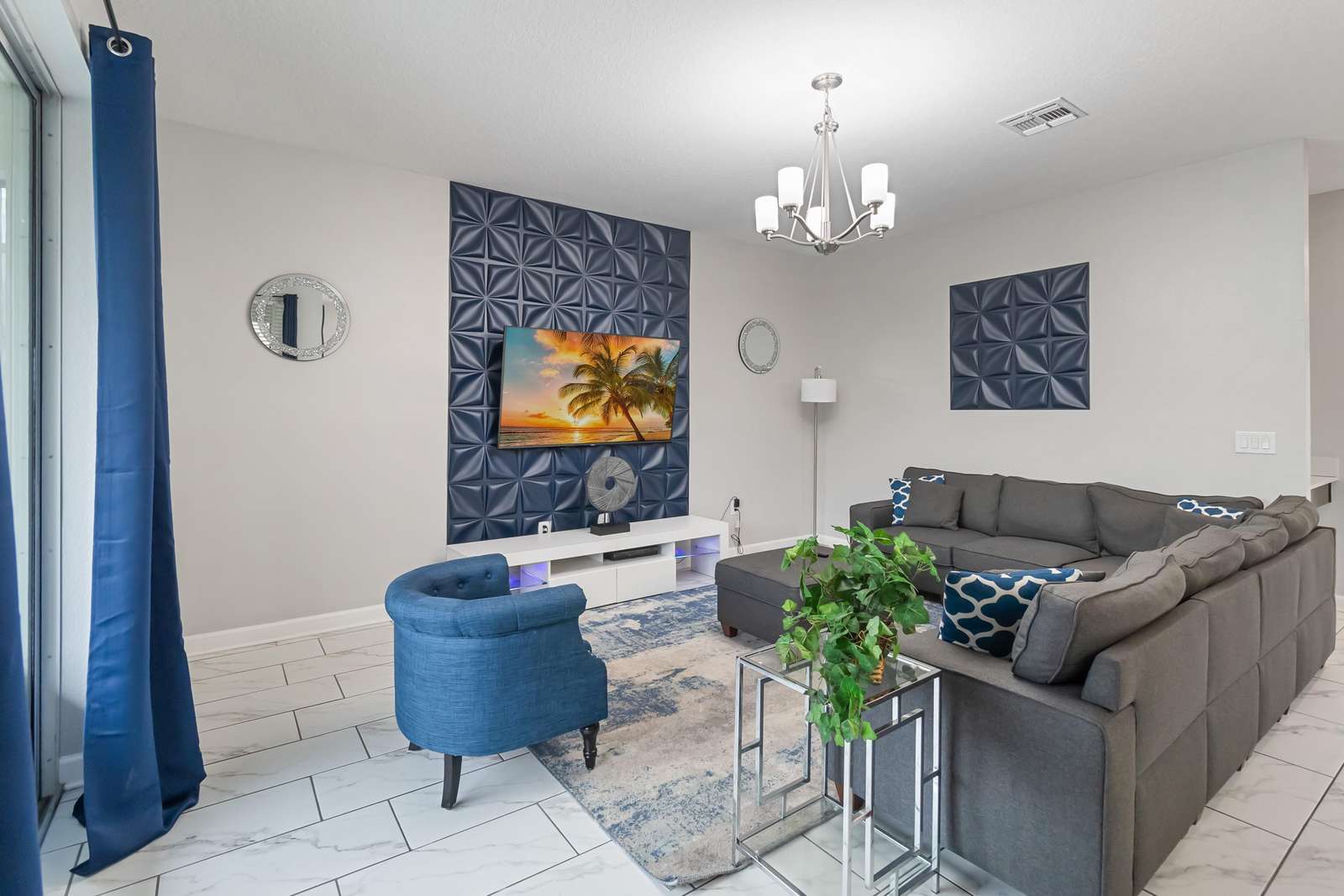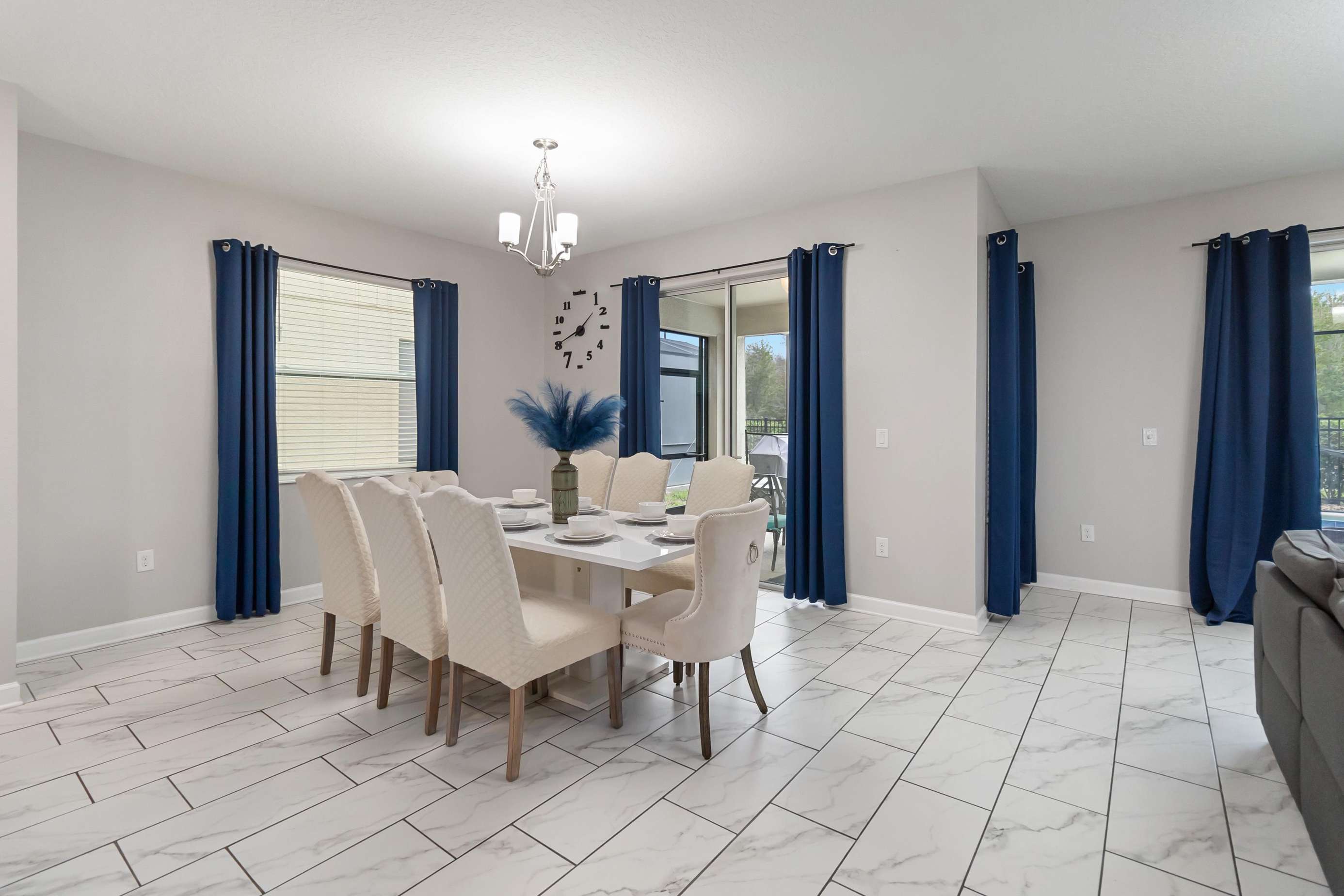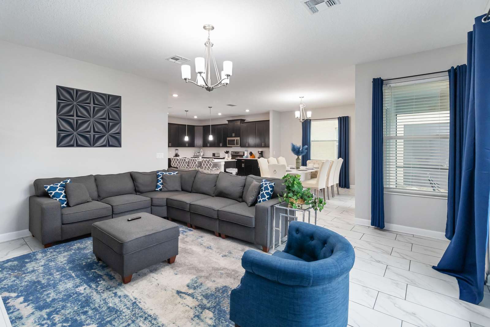 The fully equipped kitchen includes everything needed to prepare meals with ease, while the spacious living room offers a large flat-screen TV and plenty of seating for everyone. The elegant dining area features a generous table, comfortable chairs, and a beautiful chandelier that enhances every gathering.