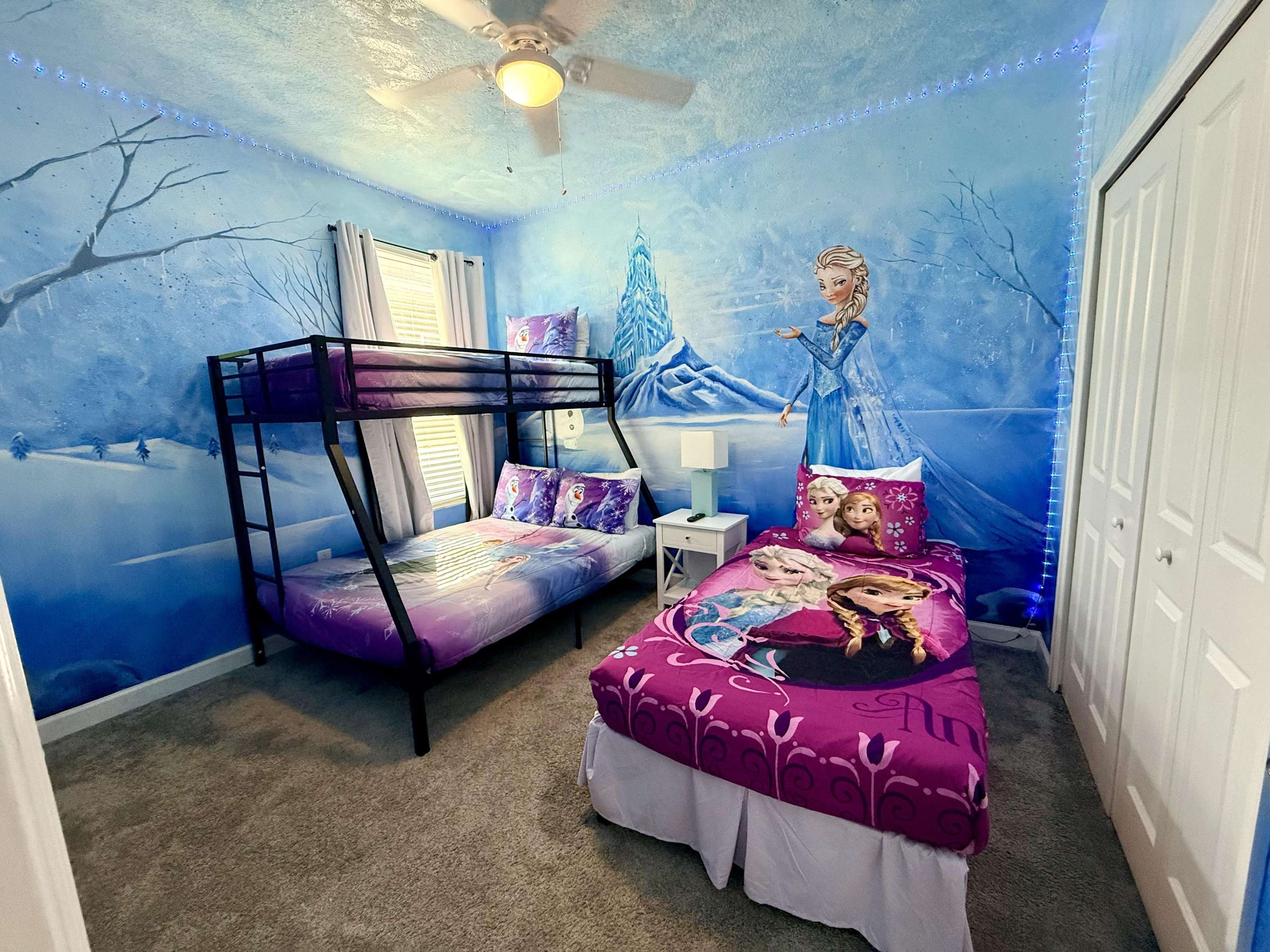 Bedroom #6 – Frozen Theme: Bunk bed and twin bed • Hand-painted Frozen mural • Themed décor. Perfect for young guests, this magical room showcases a custom Elsa and Anna mural and charming themed details.