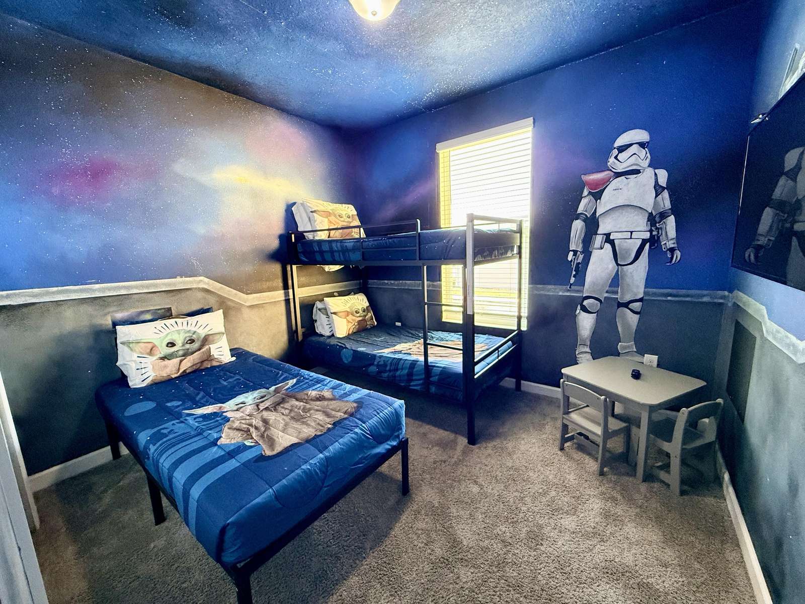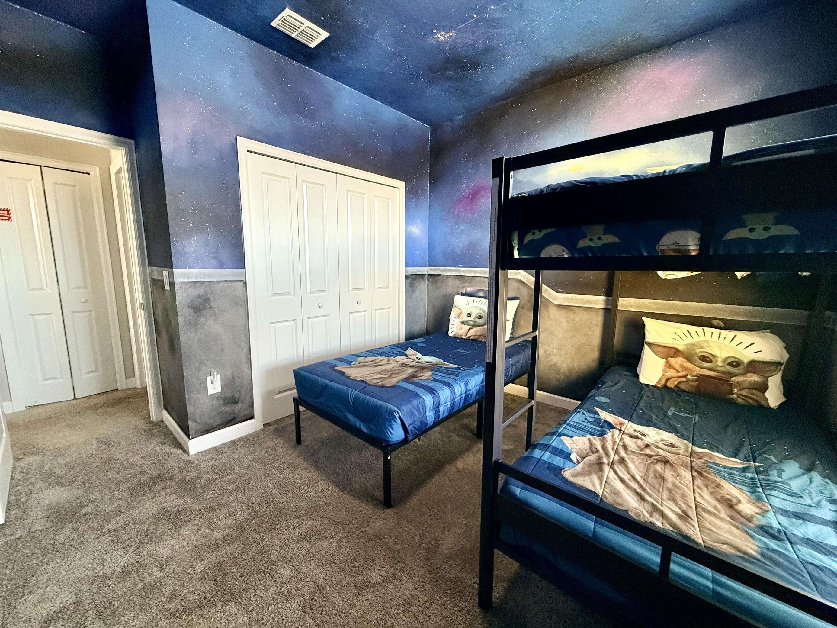 Bedroom #2: Star Wars Theme: Bunk bed and twin bed • Handmade Star Wars mural Ideal for fans of the galaxy far, far away, this room features a unique, hand-painted Star Wars design.