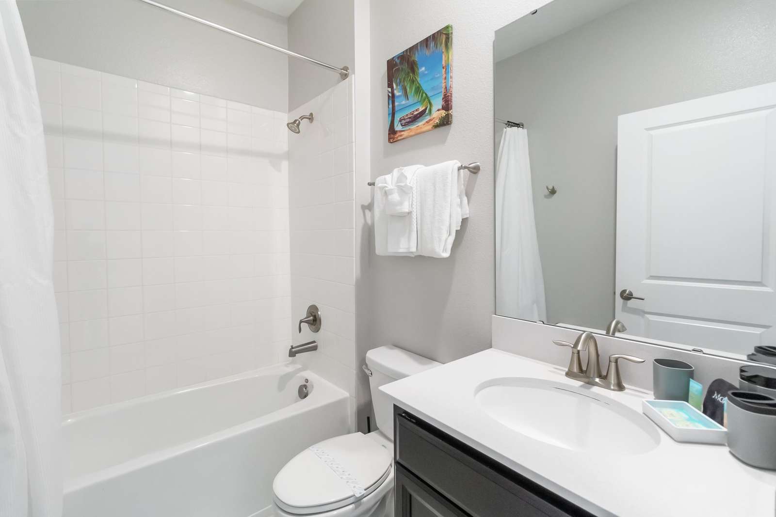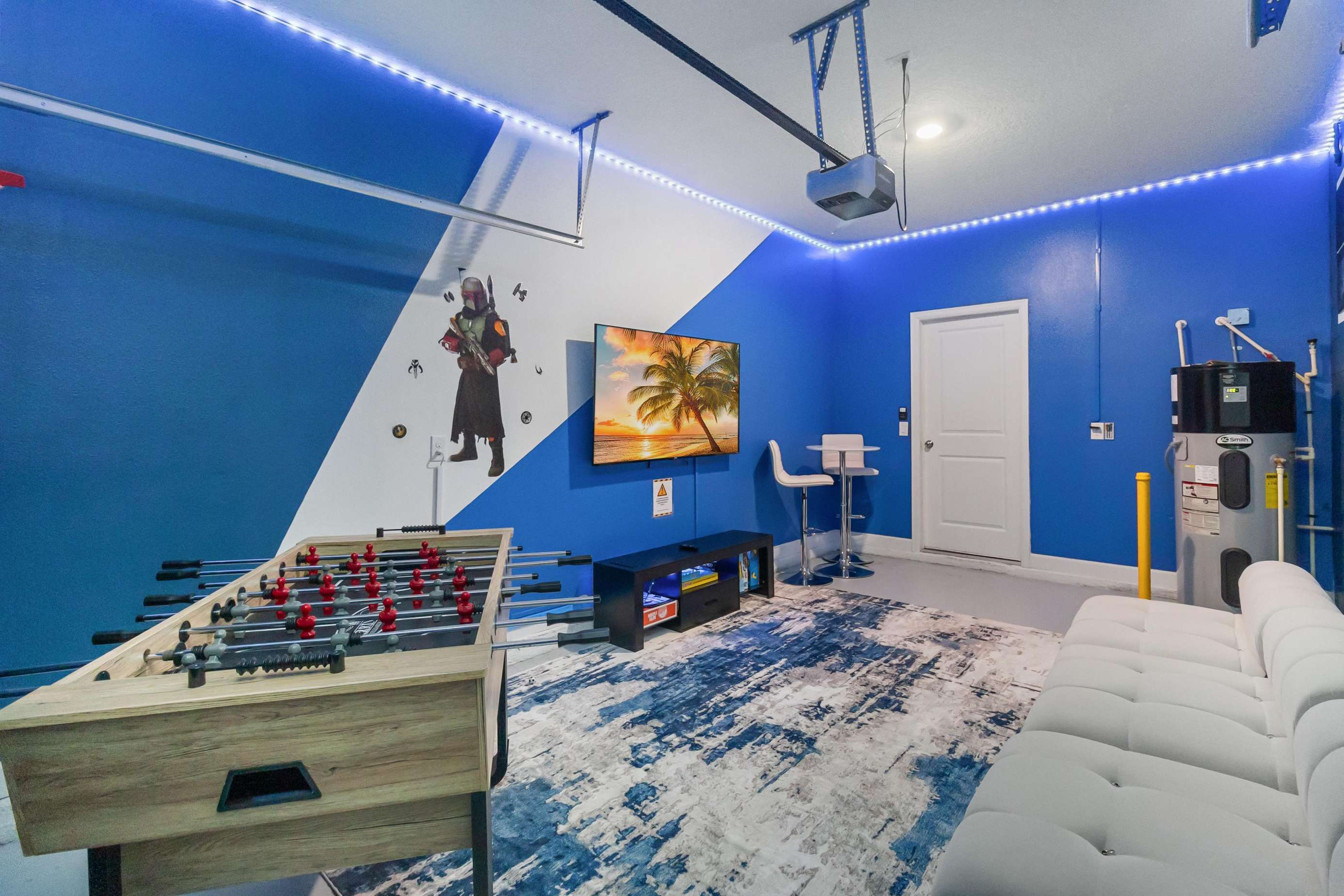 A convenient first-floor bedroom and a variety of themed and modern upstairs bedrooms provide comfort for every guest. The second floor also includes a dedicated game room with a large TV for movie nights and a soccer table for family fun.