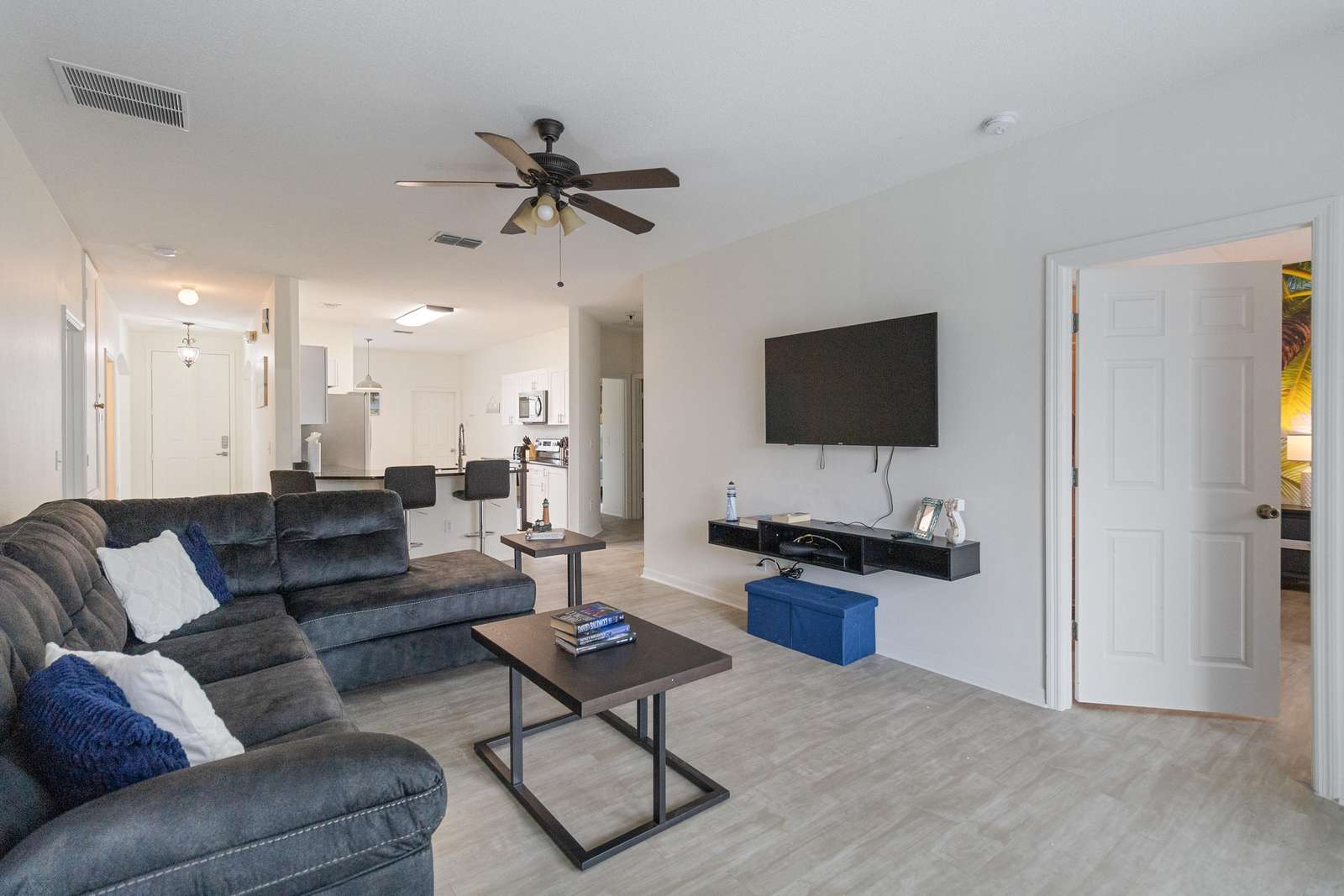 Large living room with a sectional to enjoy a movie night with the kiddos.