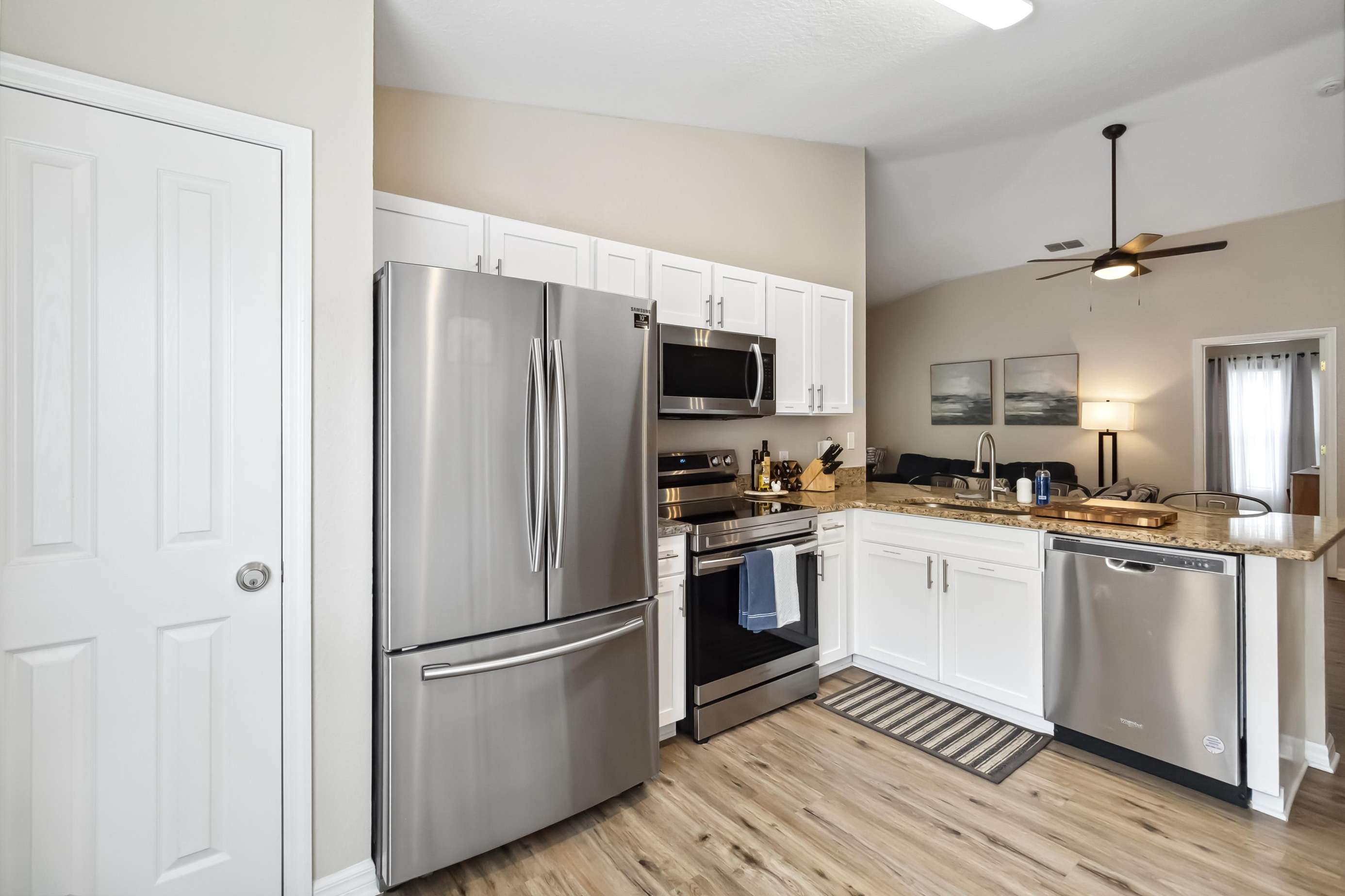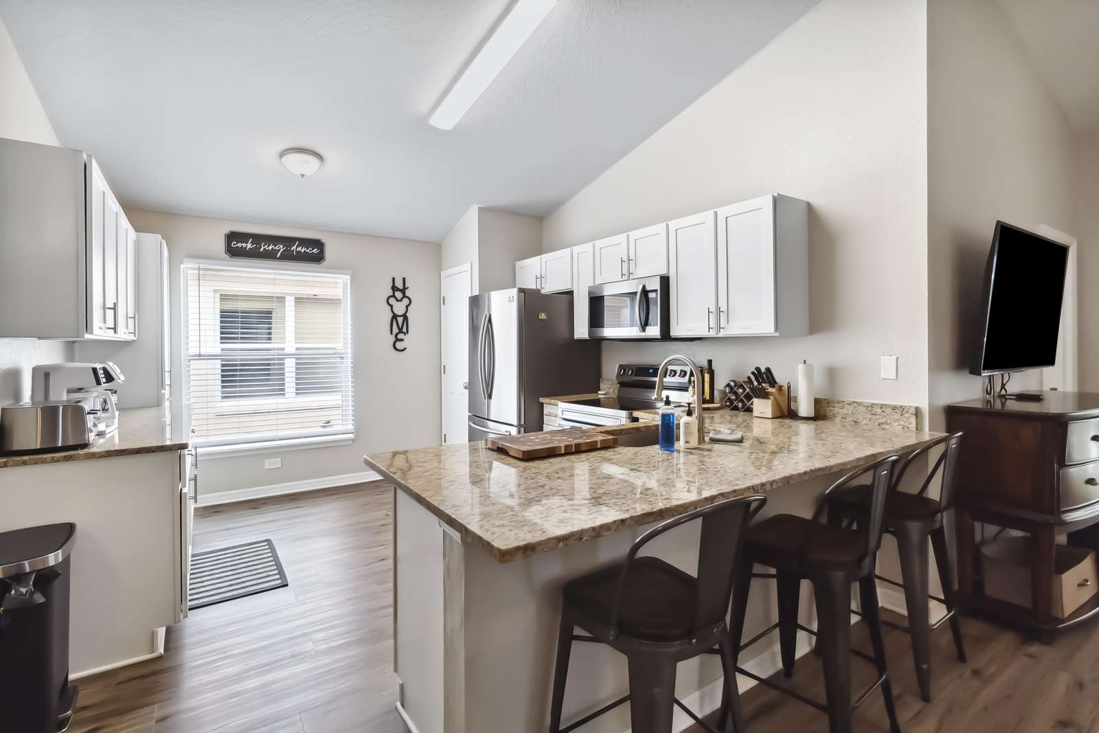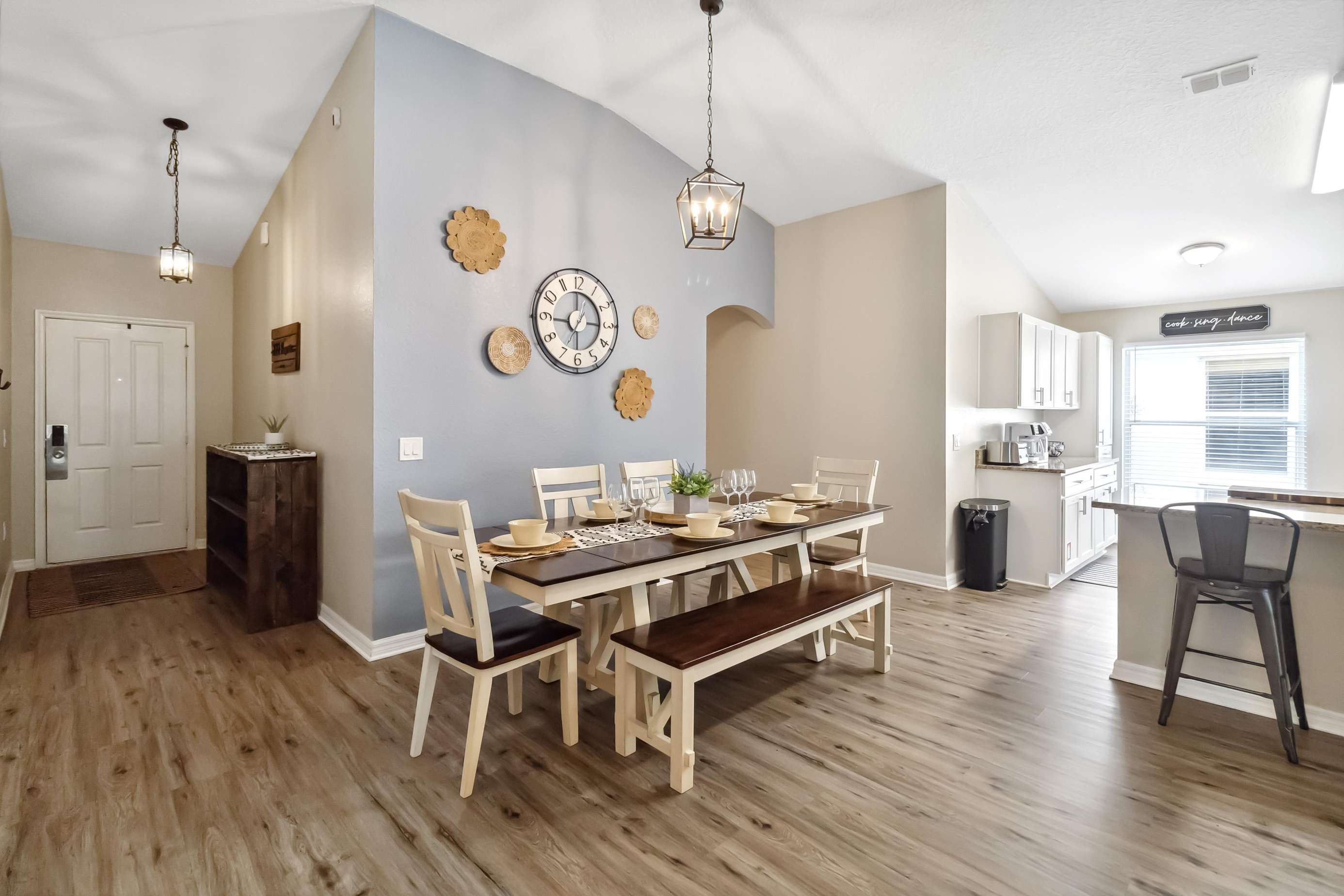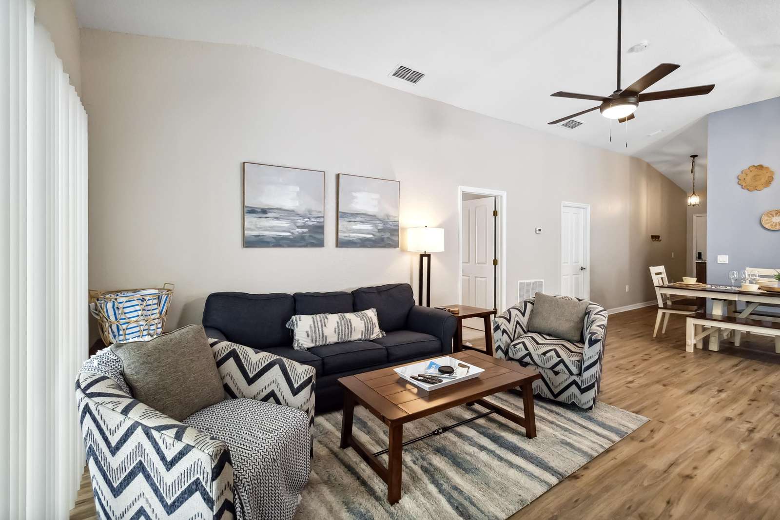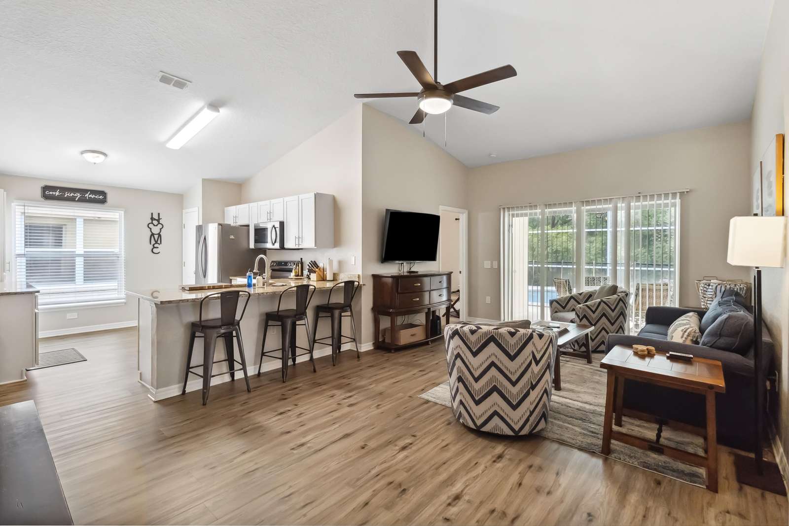Step inside to find an inviting open kitchen, perfect for preparing delicious meals for family and friends. The kitchen is fully equipped with all of the conveniences of home! The spacious living room with vaulted ceilings is adorned with a cozy blue sofa (which is also a pull-out bed) and two comfy accent chairs, setting the stage for unforgettable family movie nights.
