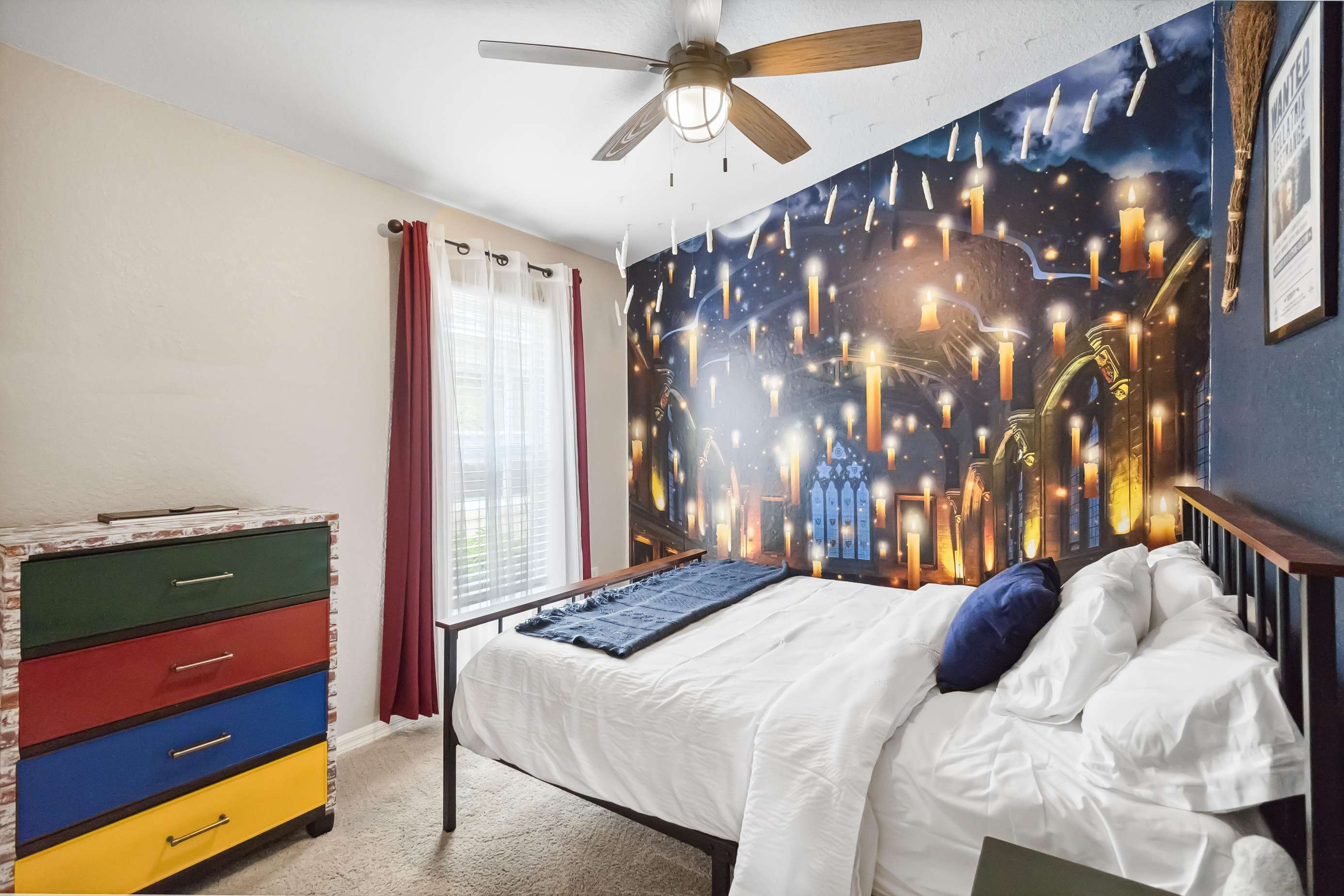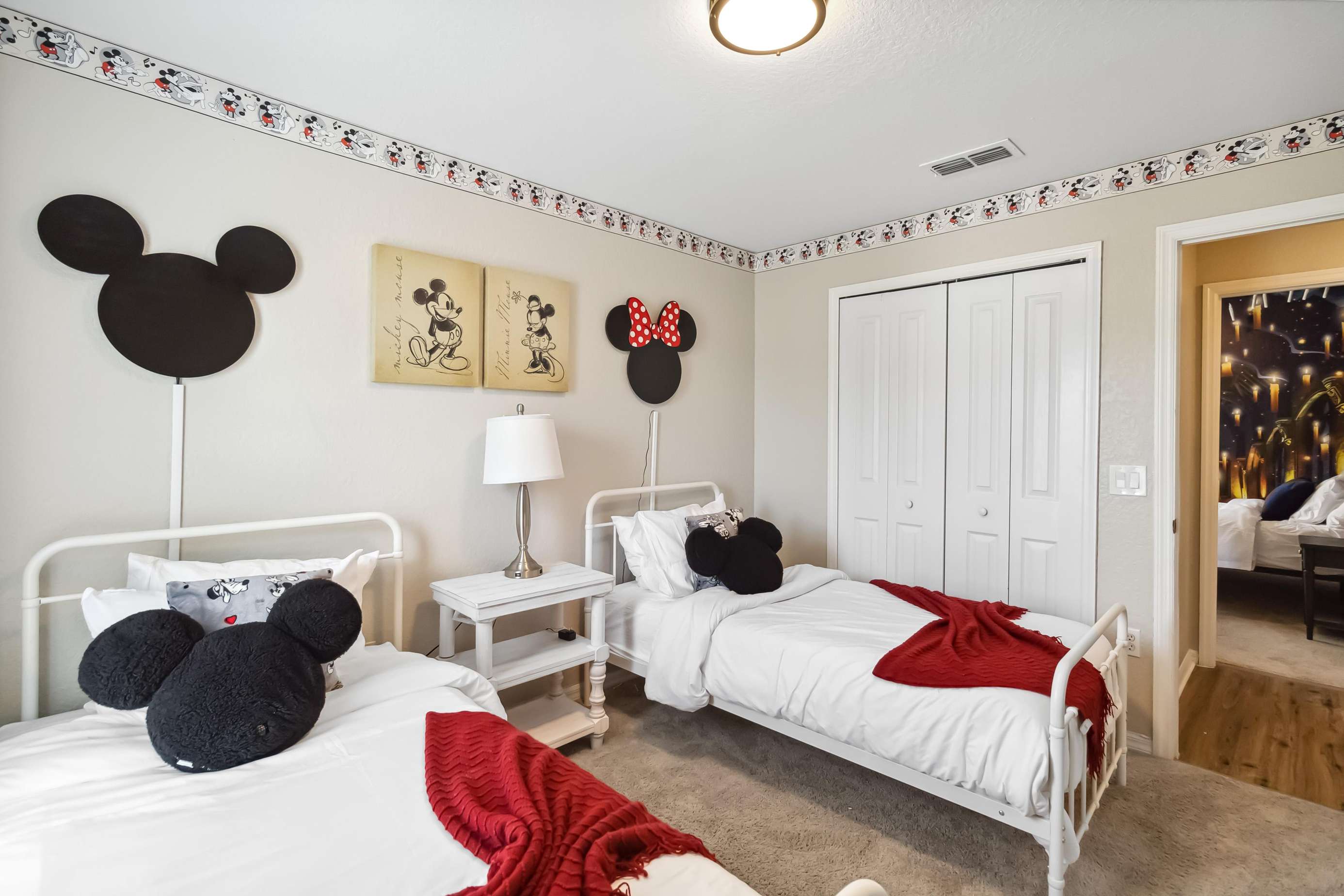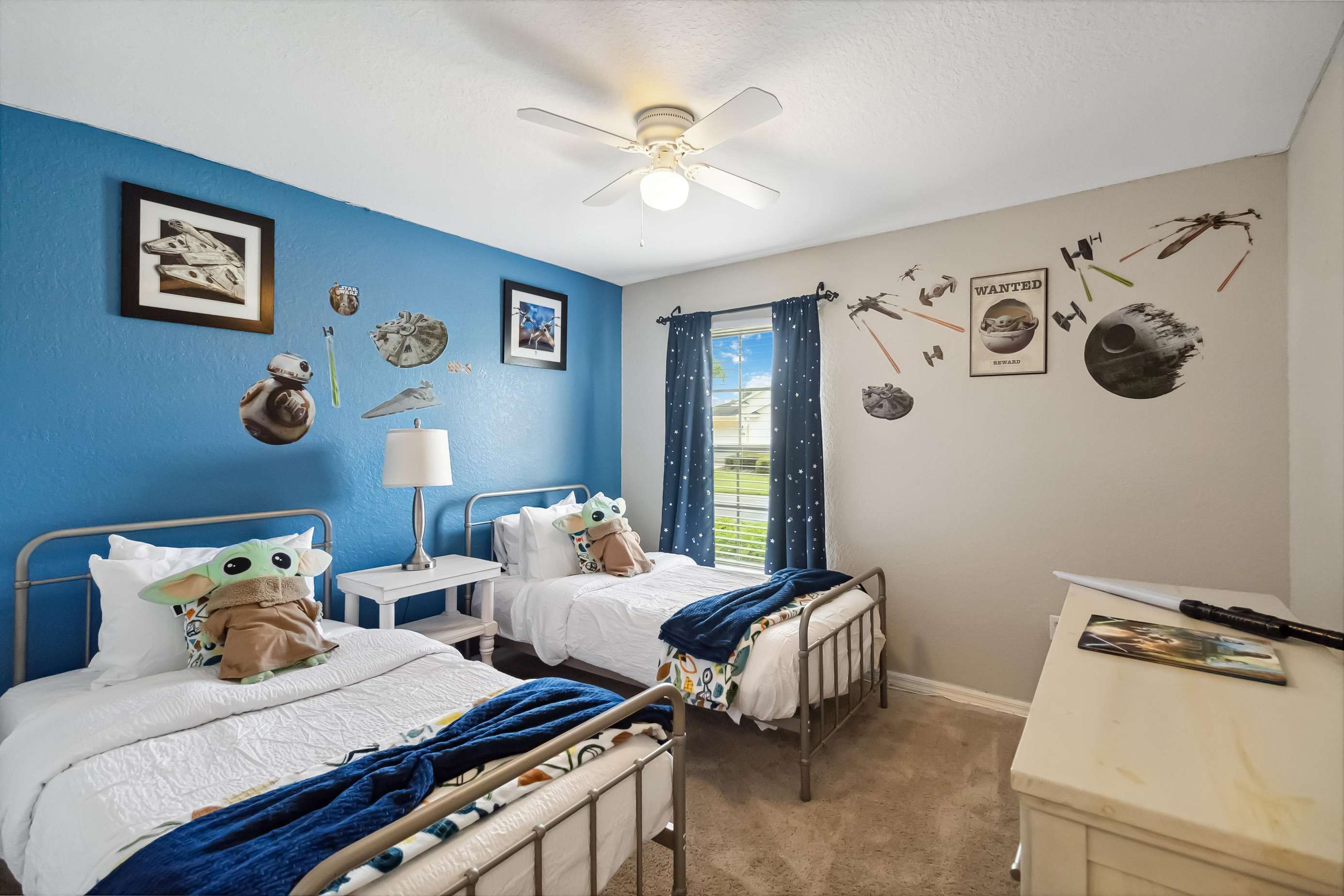 This home offers two luxurious primary bedrooms, each featuring a King bed, cable and Roku TV, and private ensuite bathrooms for ultimate comfort and privacy. The third bedroom enchants with delightful Harry Potter decor and a Full bed. The fourth bedroom showcases a playful Mickey Mouse decor with two twin beds, while the fifth bedroom delights Star Wars fans with its exquisite decor and twin beds.