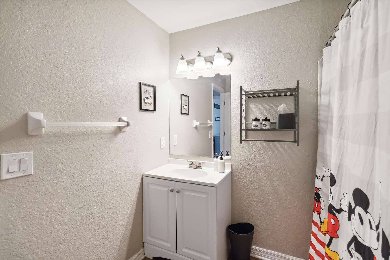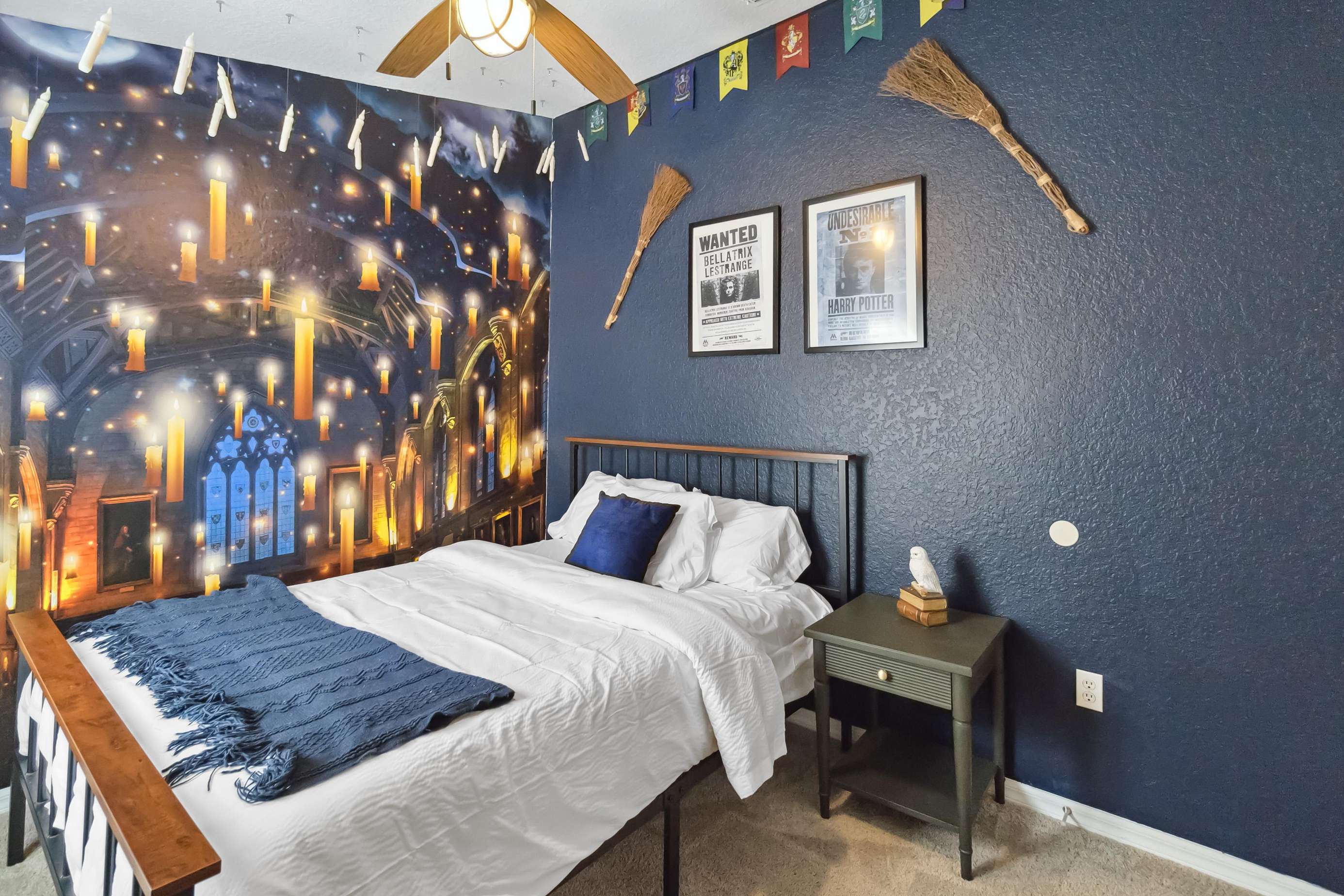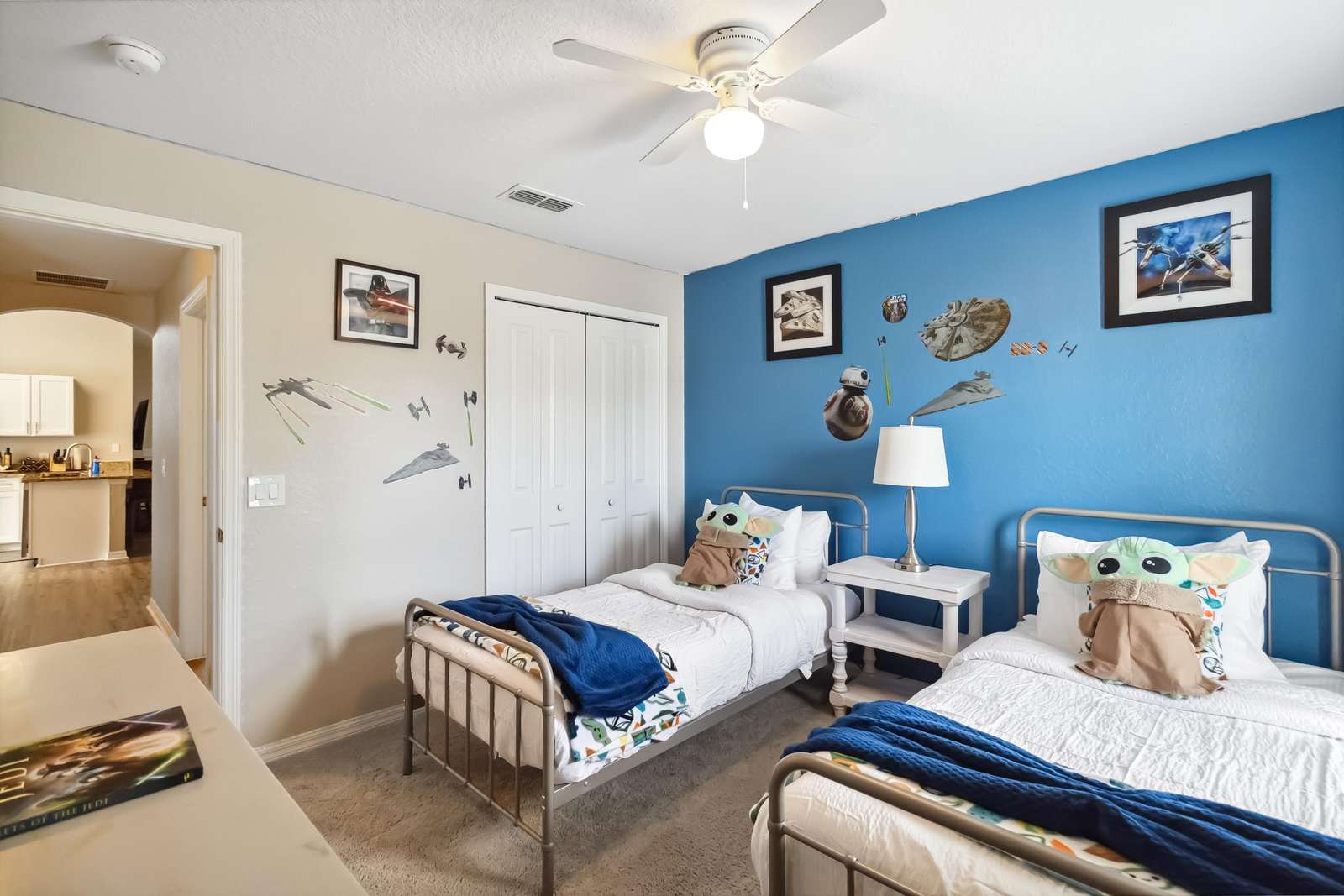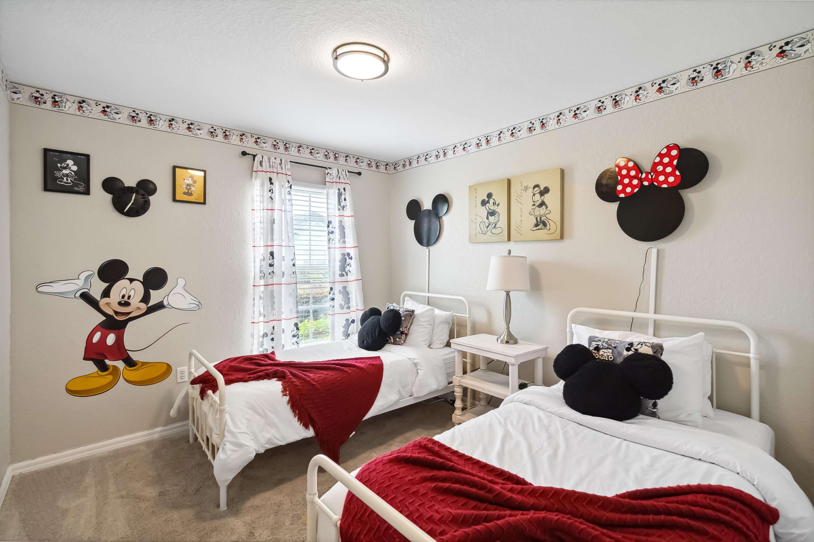 This home offers two luxurious primary bedrooms, each featuring a King bed, cable and Roku TV, and private ensuite bathrooms for ultimate comfort and privacy. The third bedroom enchants with delightful Harry Potter decor and a Full bed. The fourth bedroom showcases a playful Mickey Mouse decor with two twin beds, while the fifth bedroom delights Star Wars fans with its exquisite decor and twin beds.