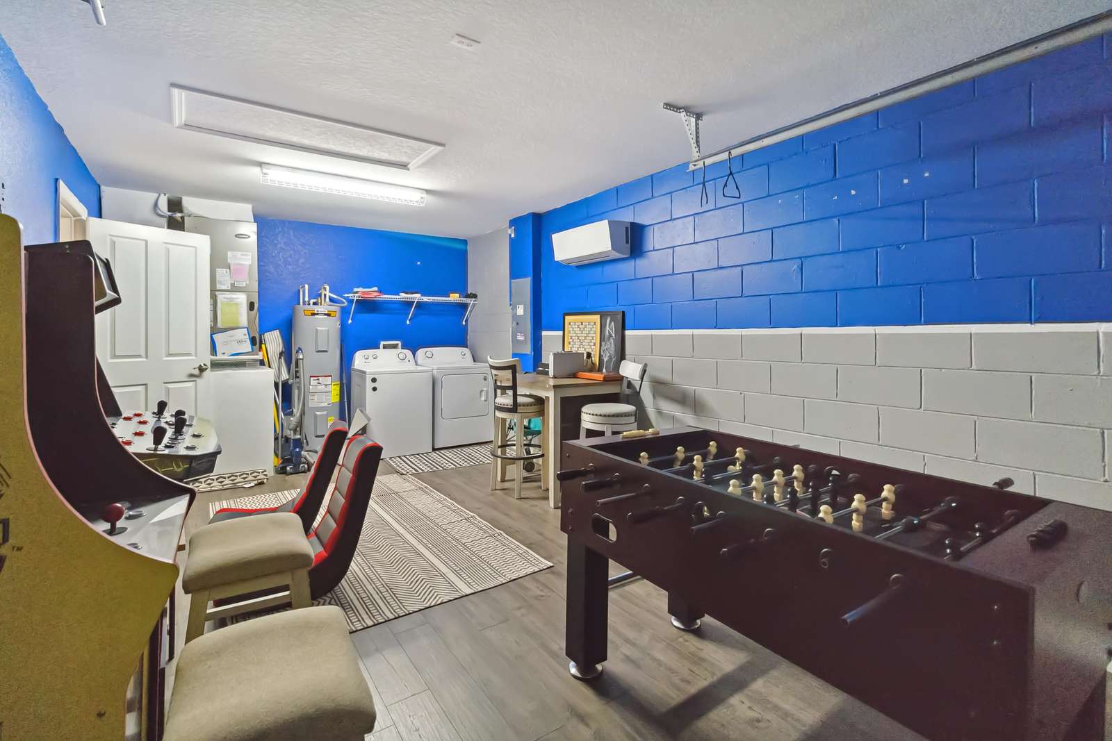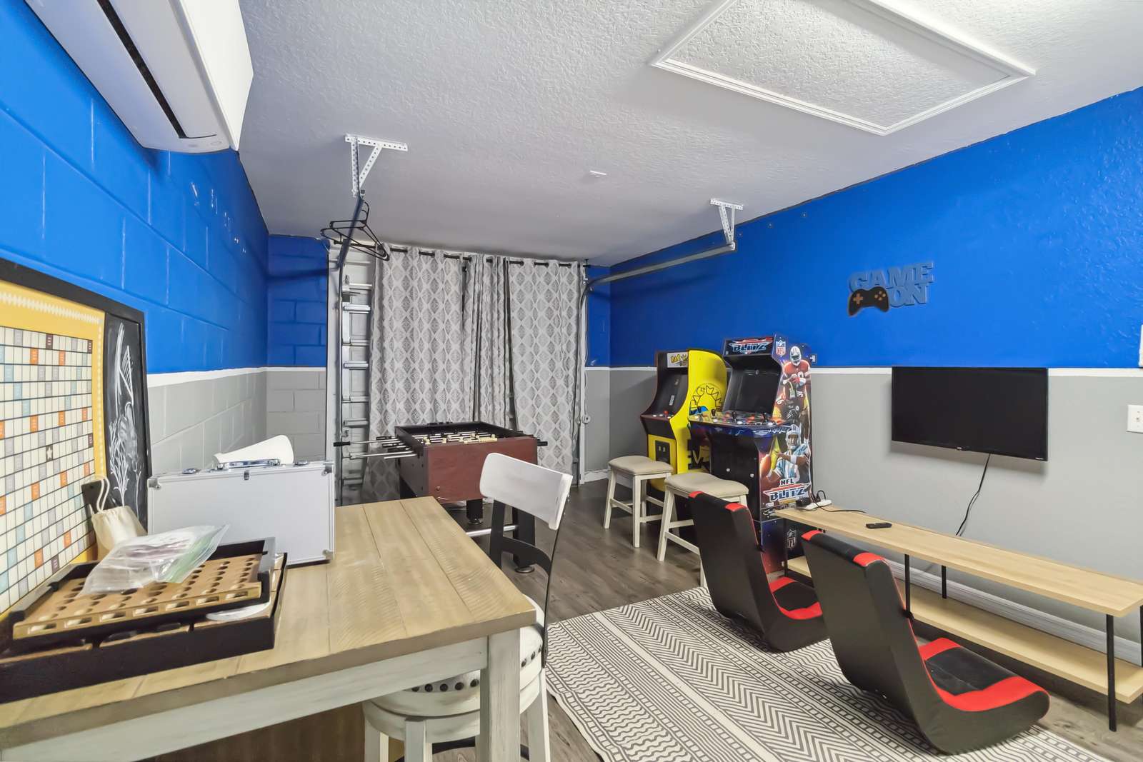 After a day at the parks, your kids will LOVE the games room in the converted garage! This kid-friendly space will provide hours of fun with board games, a TV (just bring your gaming system to connect!) PLUS two arcade games – Pac Man and NFL. These will keep your young guests entertained for hours. This space has also been equipped with a split AC unit to enjoy hours of fun in a temperature controlled setting.