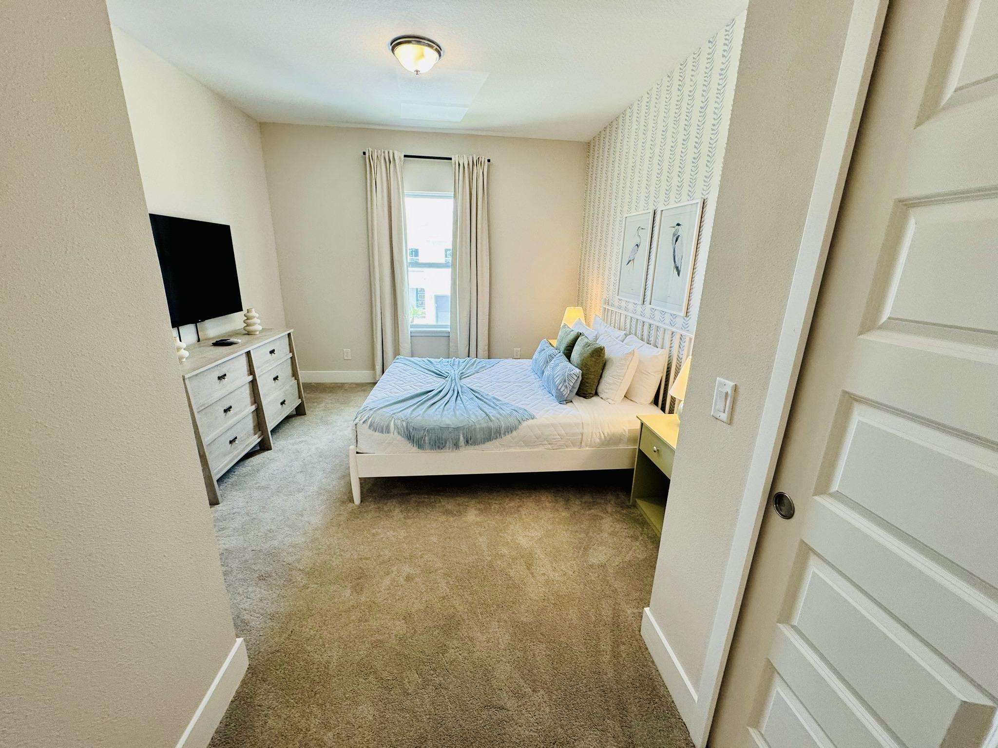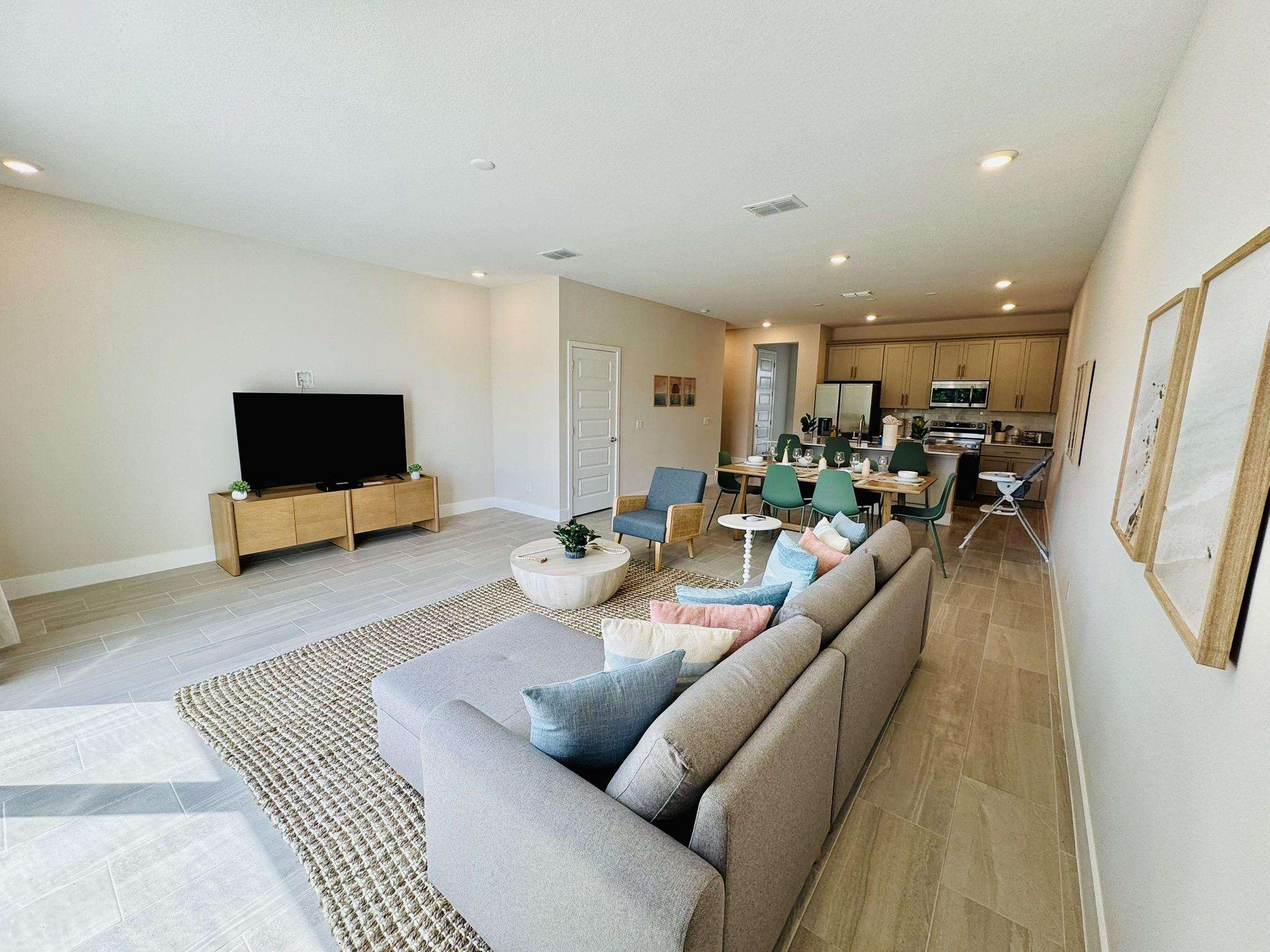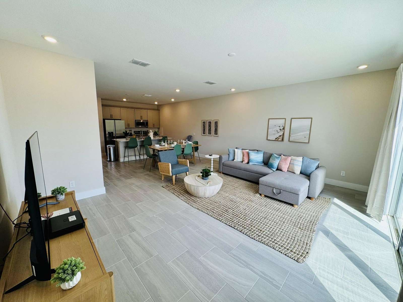 The open-concept living room includes a large TV for cozy family movie nights. Enjoy exclusive access, playground, fitness center, and community pool. With three on-site dining options and complimentary shuttles, you’ll have everything you need for a truly relaxing stay.