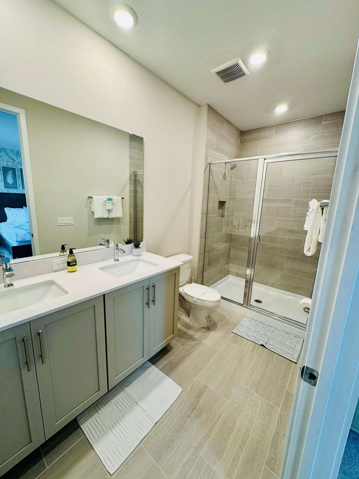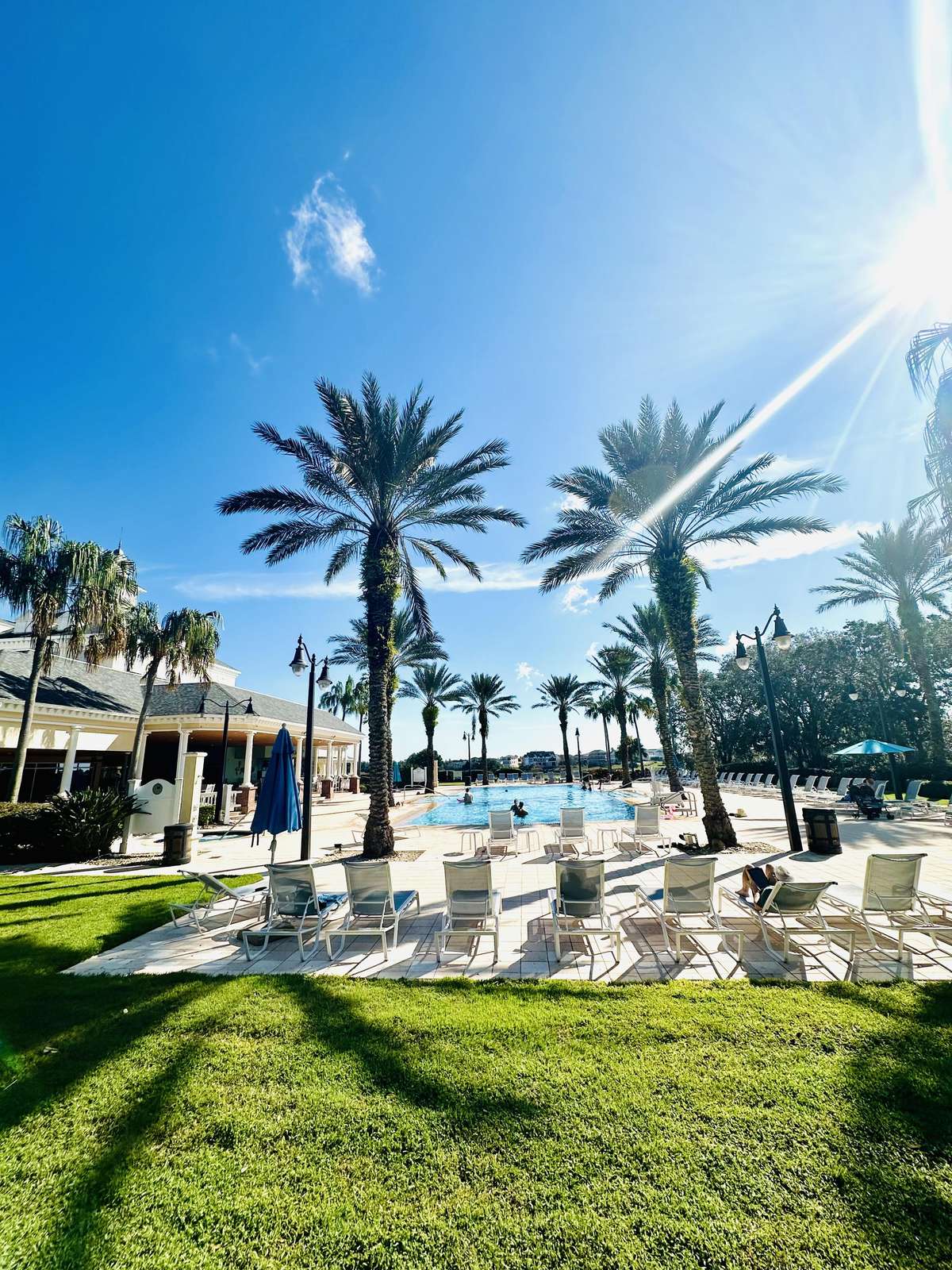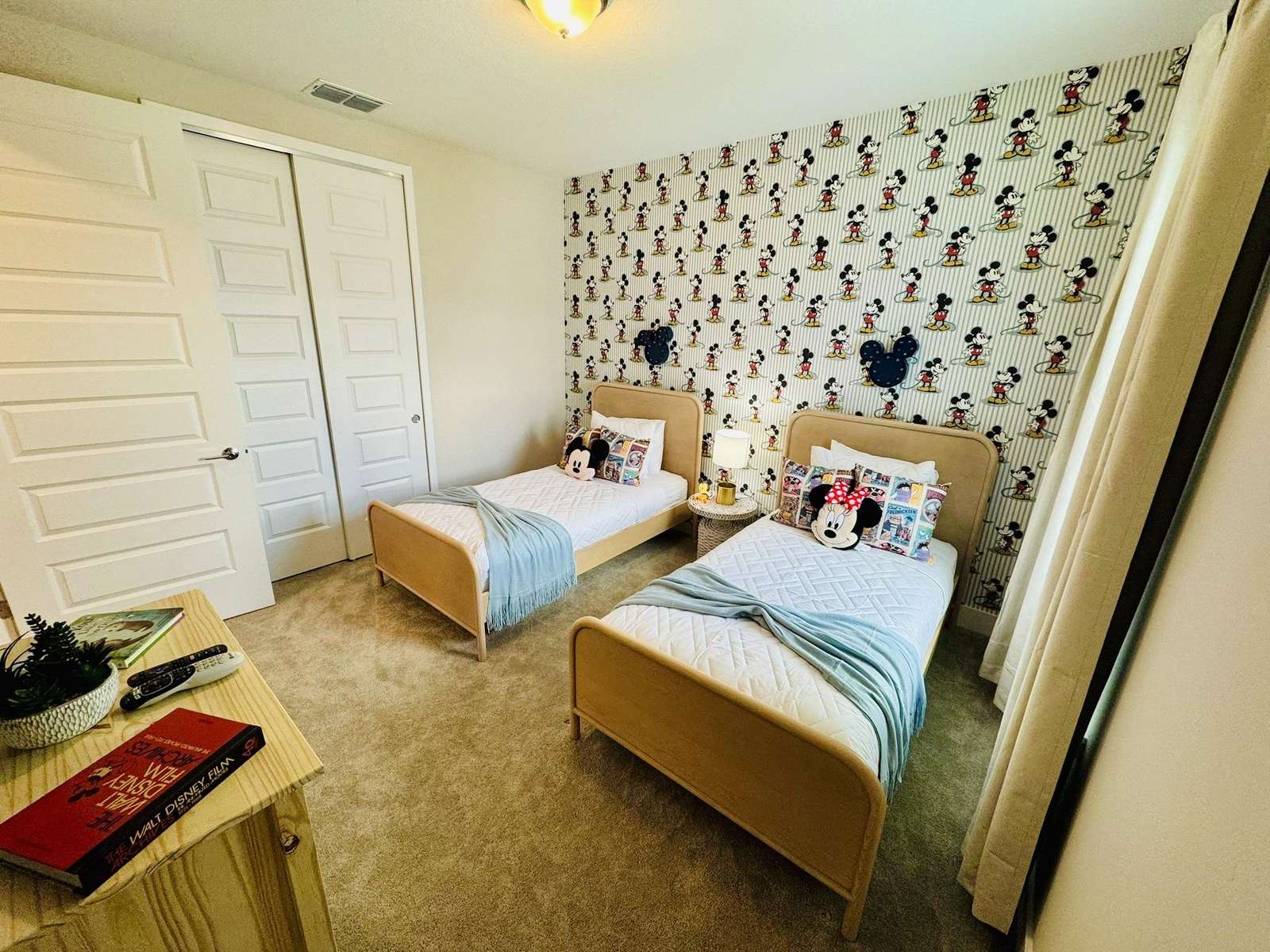 The open-concept living room includes a large TV for cozy family movie nights. Enjoy exclusive access, playground, fitness center, and community pool. With three on-site dining options and complimentary shuttles, you’ll have everything you need for a truly relaxing stay.