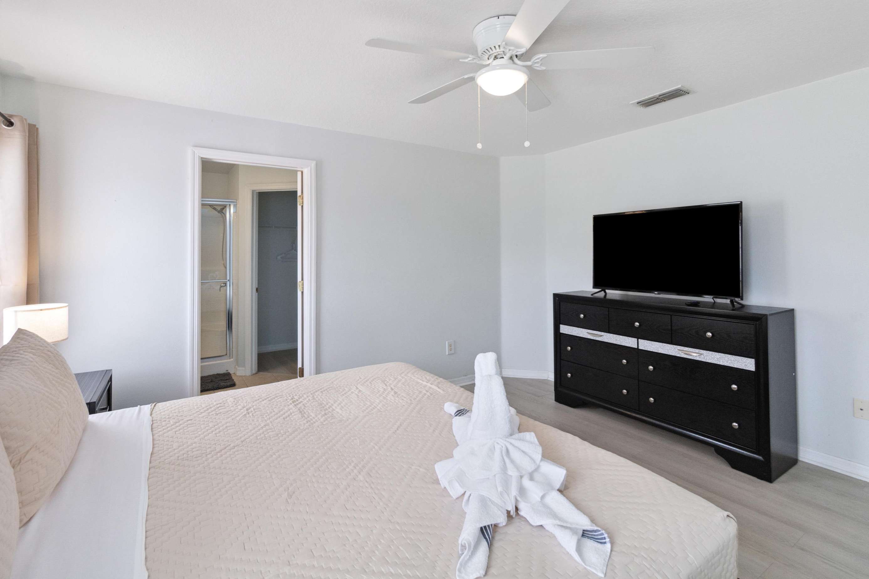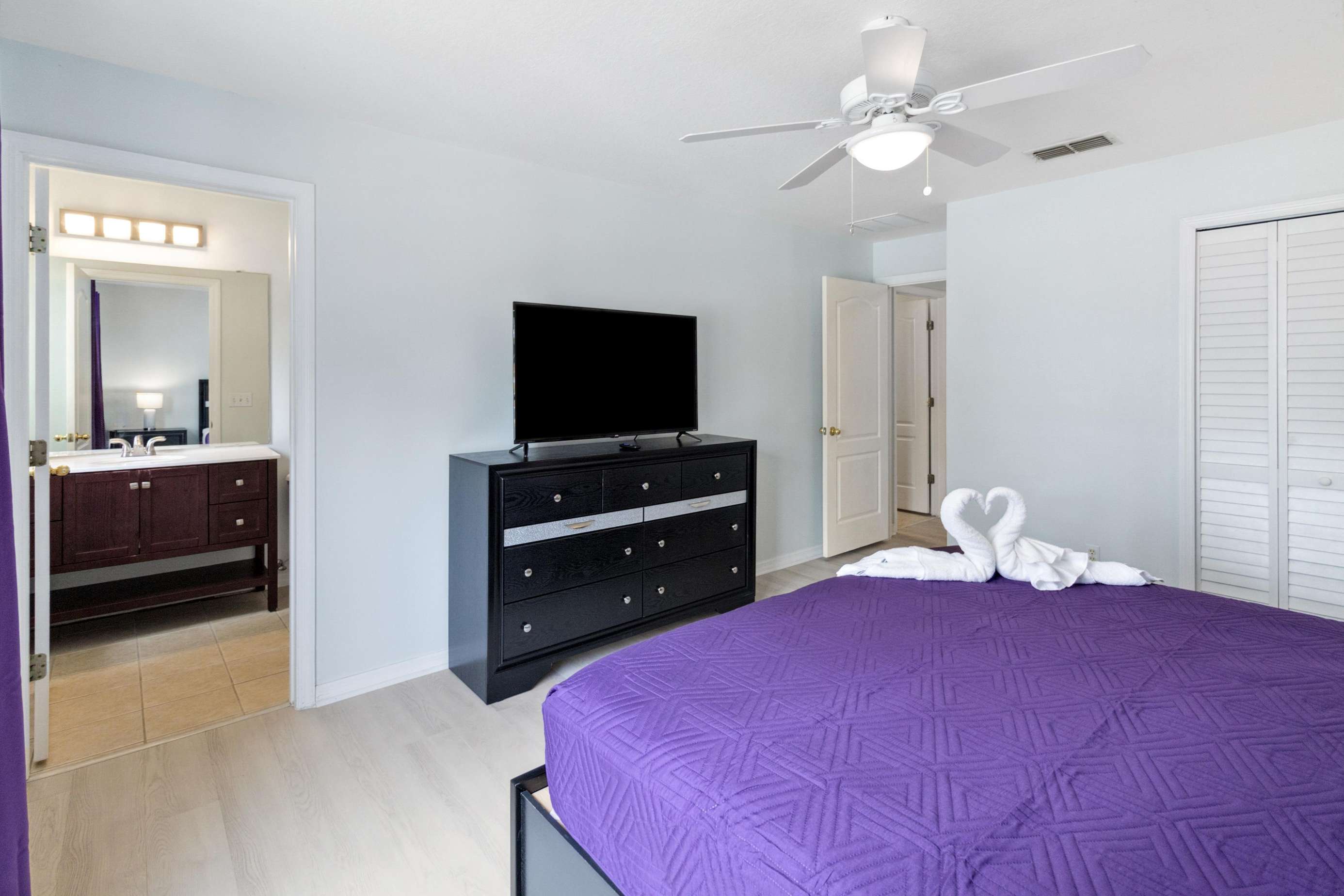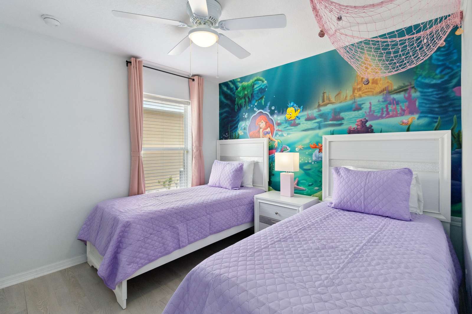 The bedrooms consist of Room #1 A King master suite with an exquisite beige decoration comes with own bath, a walk-in shower and a large TV. The bedroom #2 is nicely decor with purple color, comes with a King bed and a large TV. The Bedroom #3 will transport you to the Harry Potter adventure and comes with two twin beds. Dive in to a Little Mermaid world, perfect for our little princess, this bedroom comes with two twin beds.