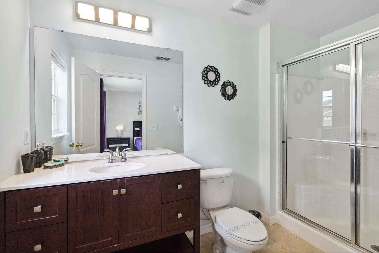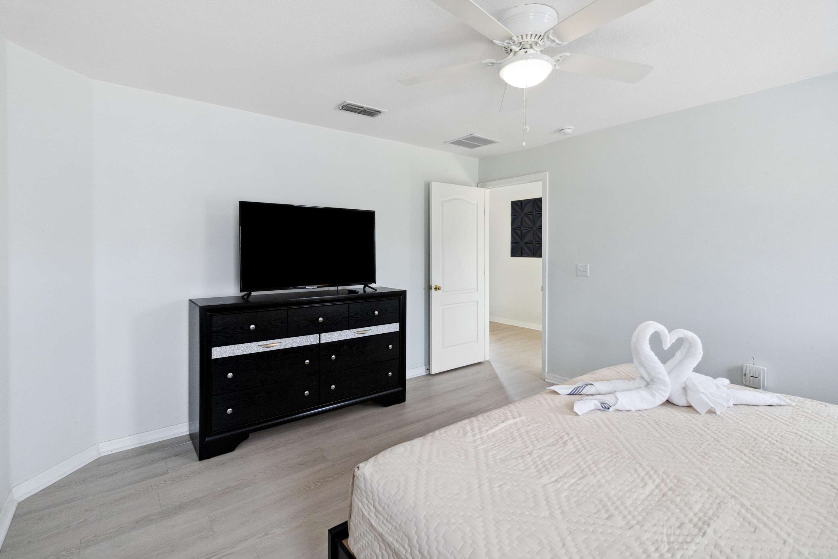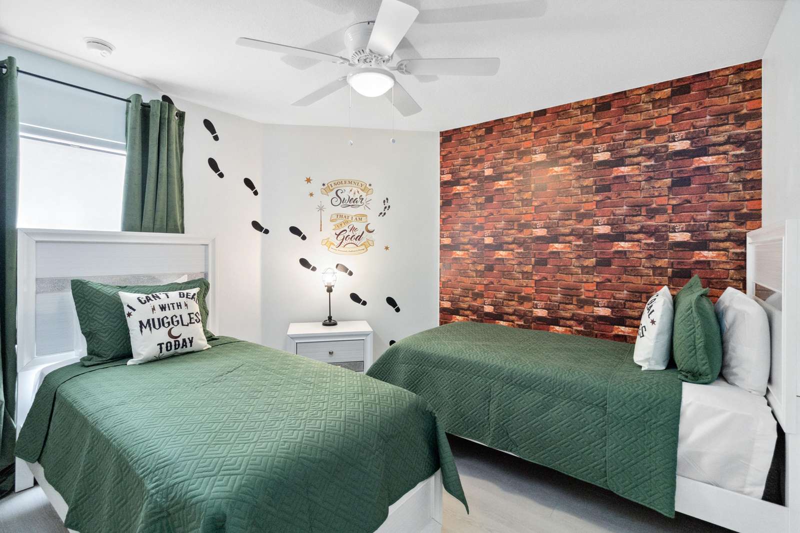 The bedrooms consist of Room #1 A King master suite with an exquisite beige decoration comes with own bath, a walk-in shower and a large TV. The bedroom #2 is nicely decor with purple color, comes with a King bed and a large TV. The Bedroom #3 will transport you to the Harry Potter adventure and comes with two twin beds. Dive in to a Little Mermaid world, perfect for our little princess, this bedroom comes with two twin beds.