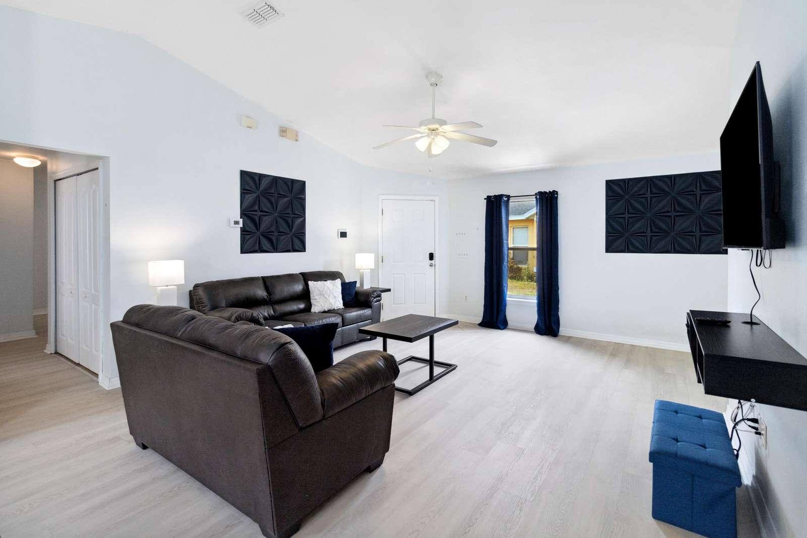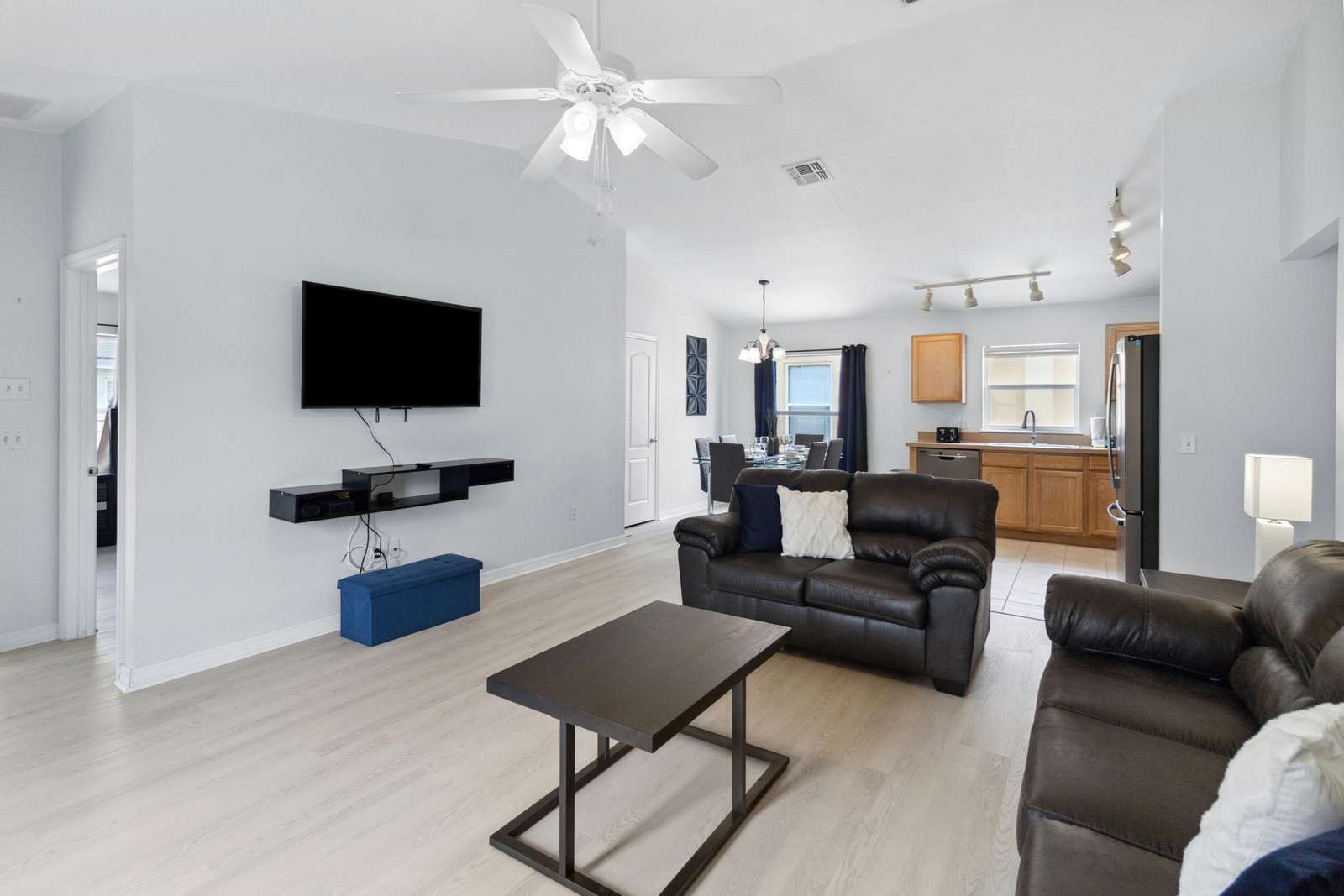 Open living room is spacious with comfortable seating and 55” TV to enjoy a family movie night or simply sit and enjoy the view to the pool area.