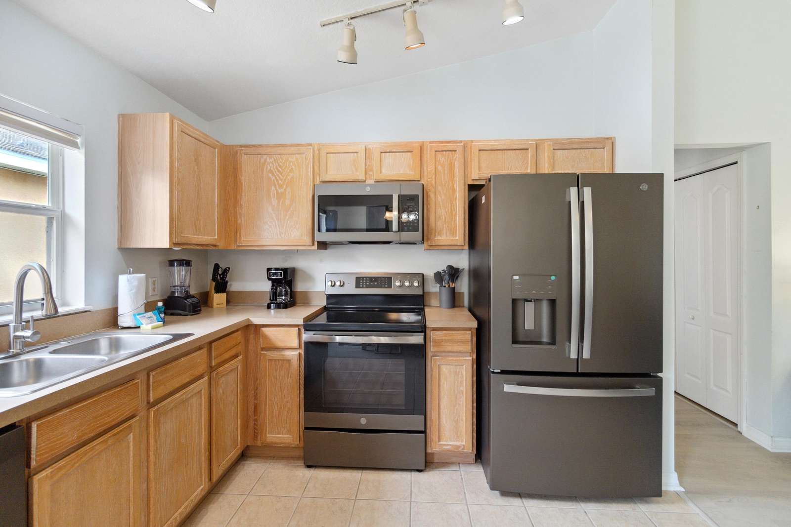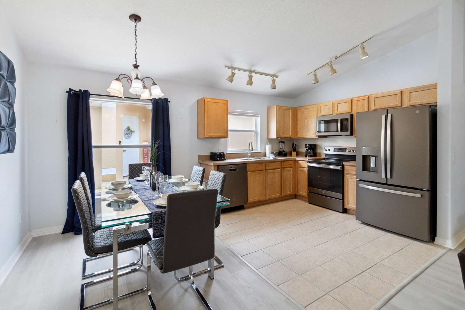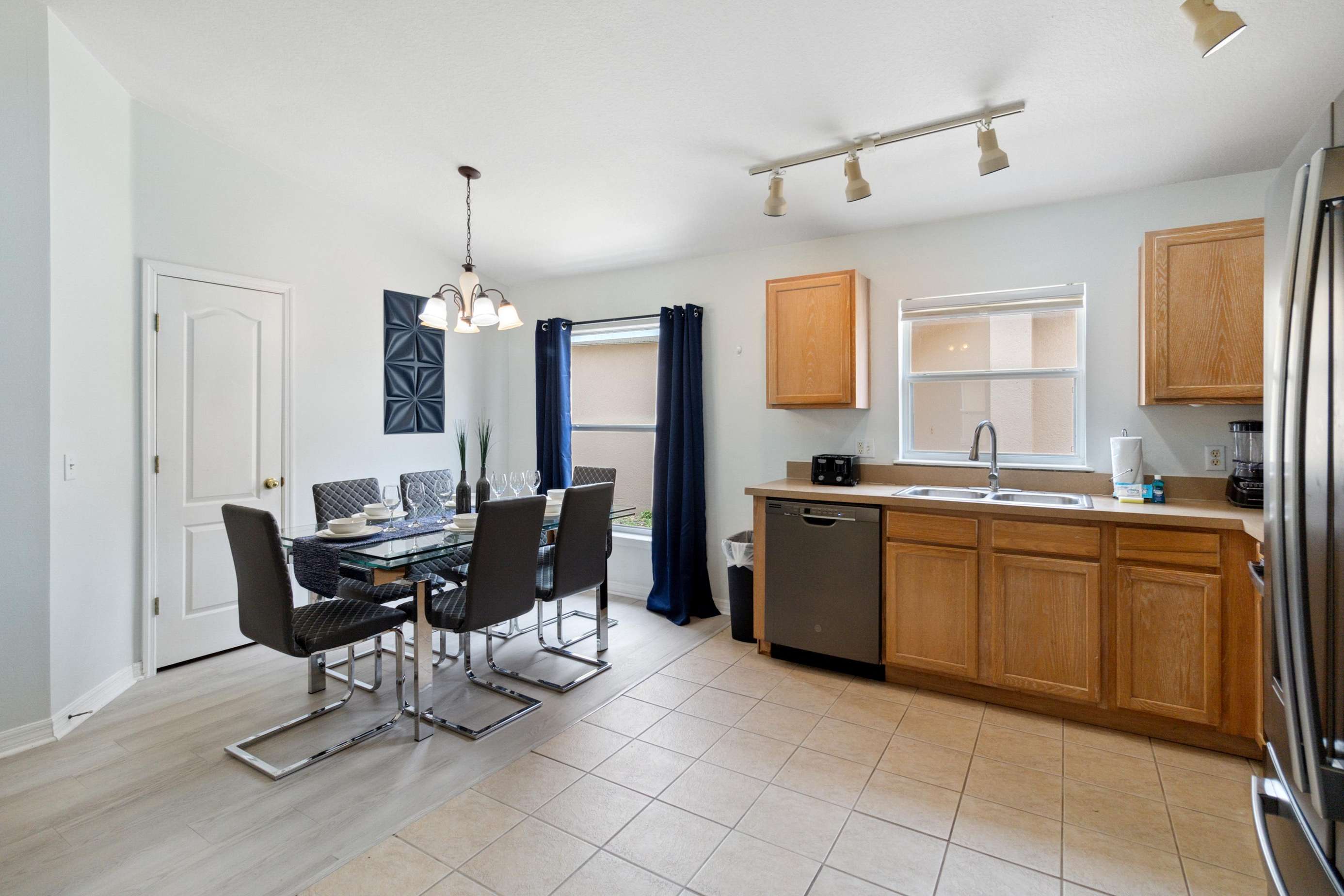 Spacious kitchen and cozy living area with pool access